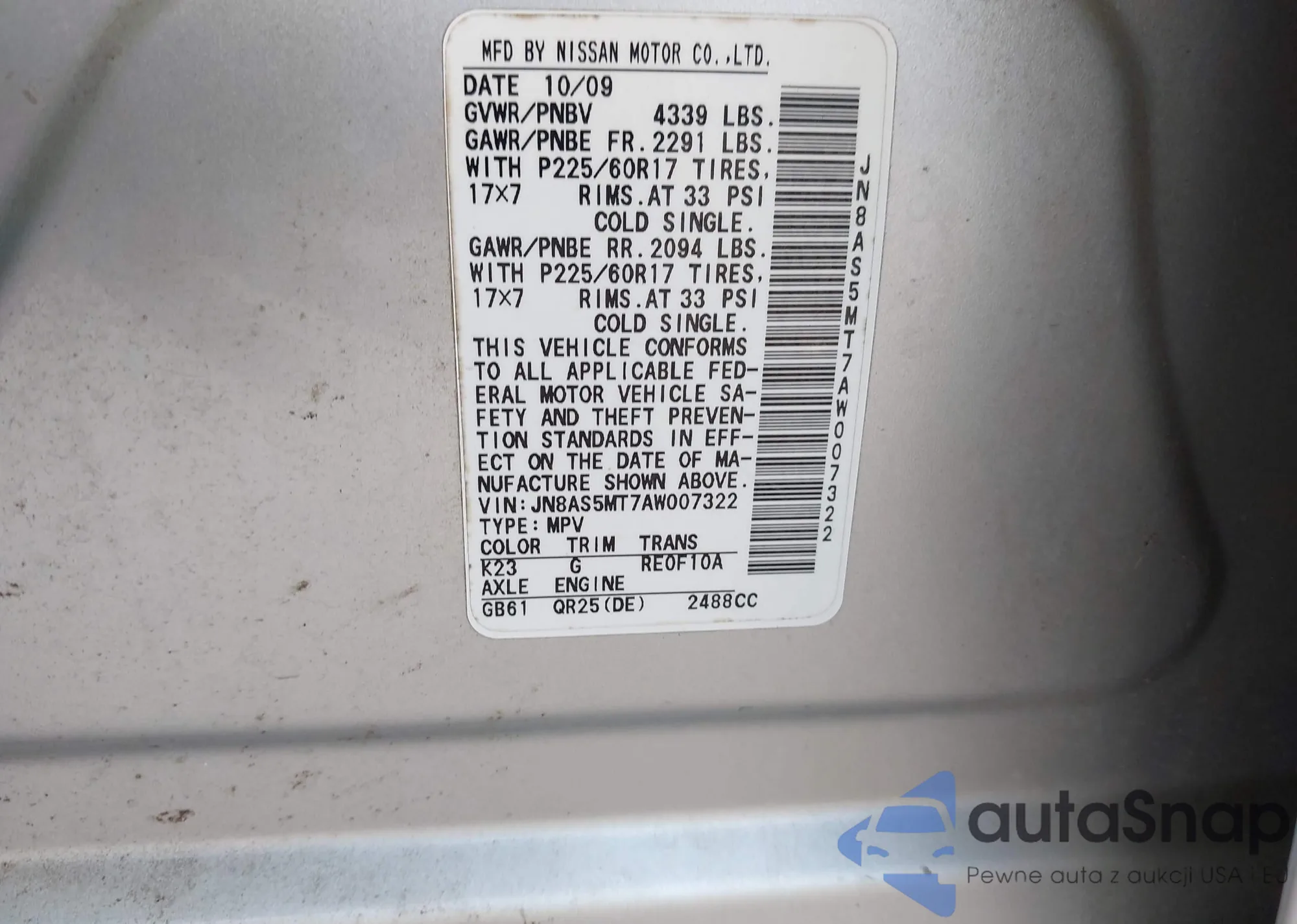 • VIN JN8AS5MT7AW007322
