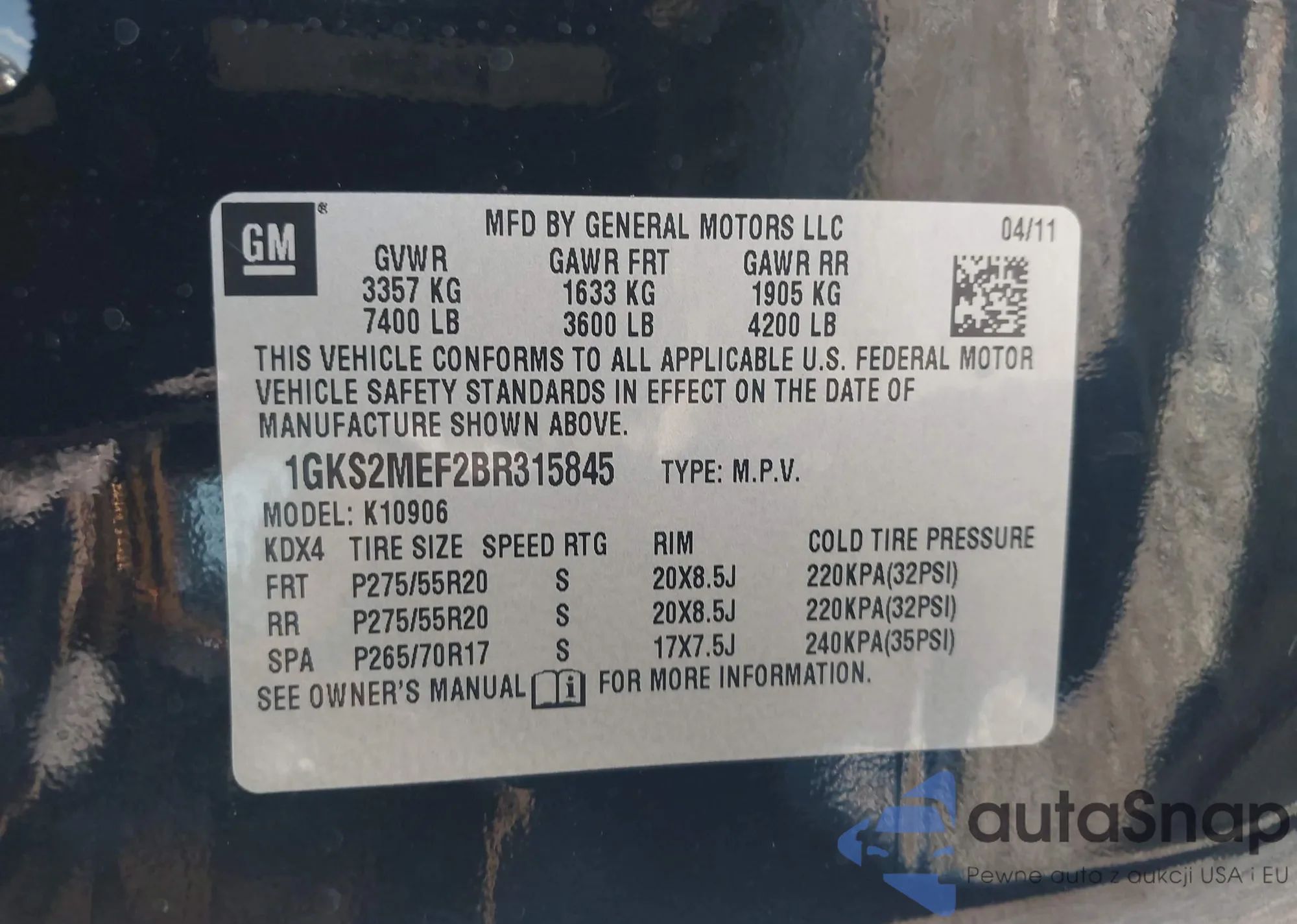 LOT: 41904267 VIN: 1GKS2MEF2BR315845