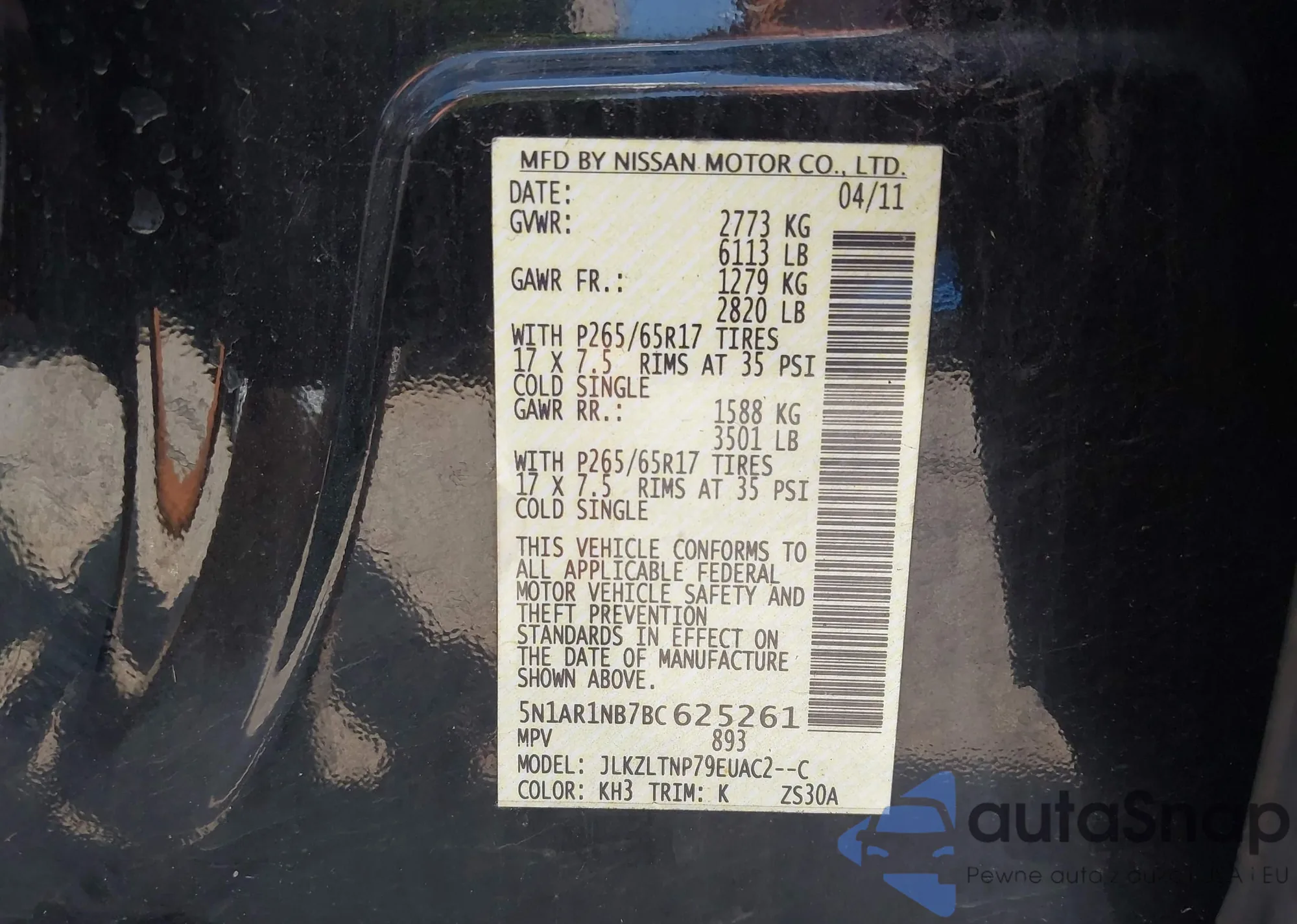 • VIN 5N1AR1NB7BC625261