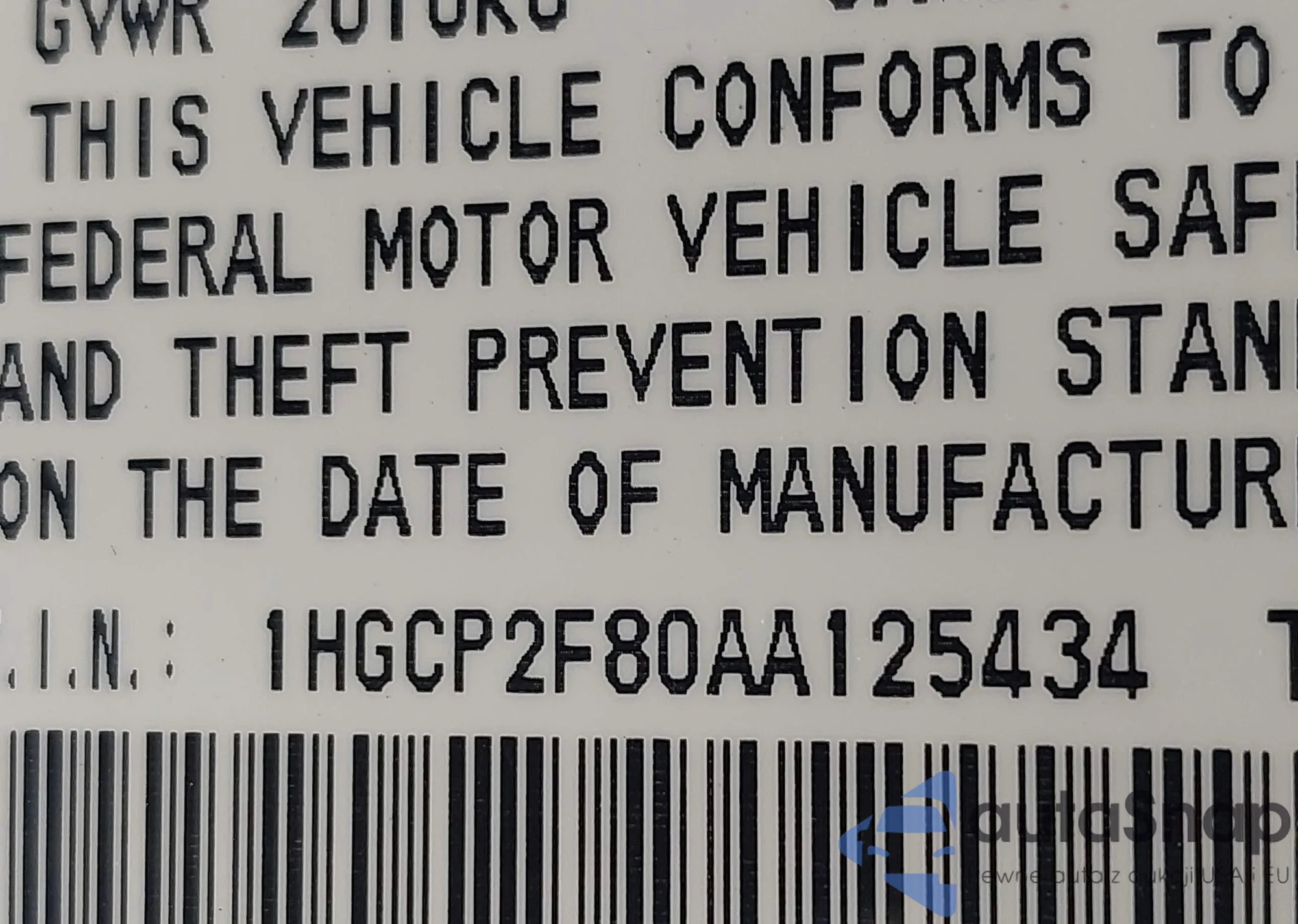 • VIN 1HGCP2F80AA125434