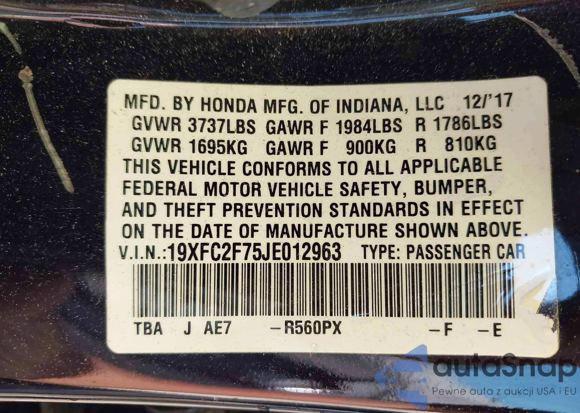 LOT: 43103562 VIN: 19XFC2F75JE012963