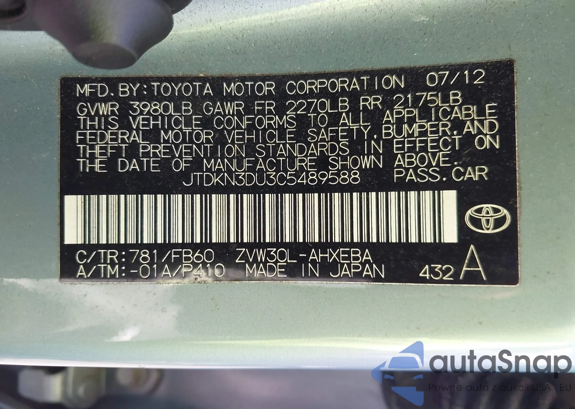 LOT: 43104064 VIN: JTDKN3DU3C5489588