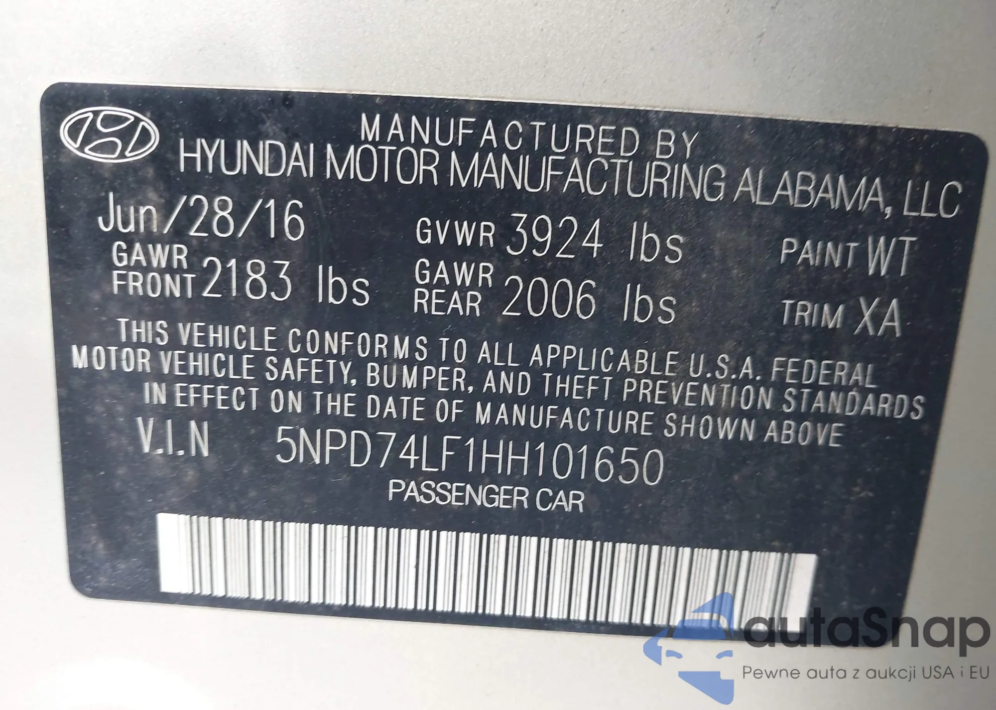LOT: 43131793 VIN: 5NPD74LF1HH101650