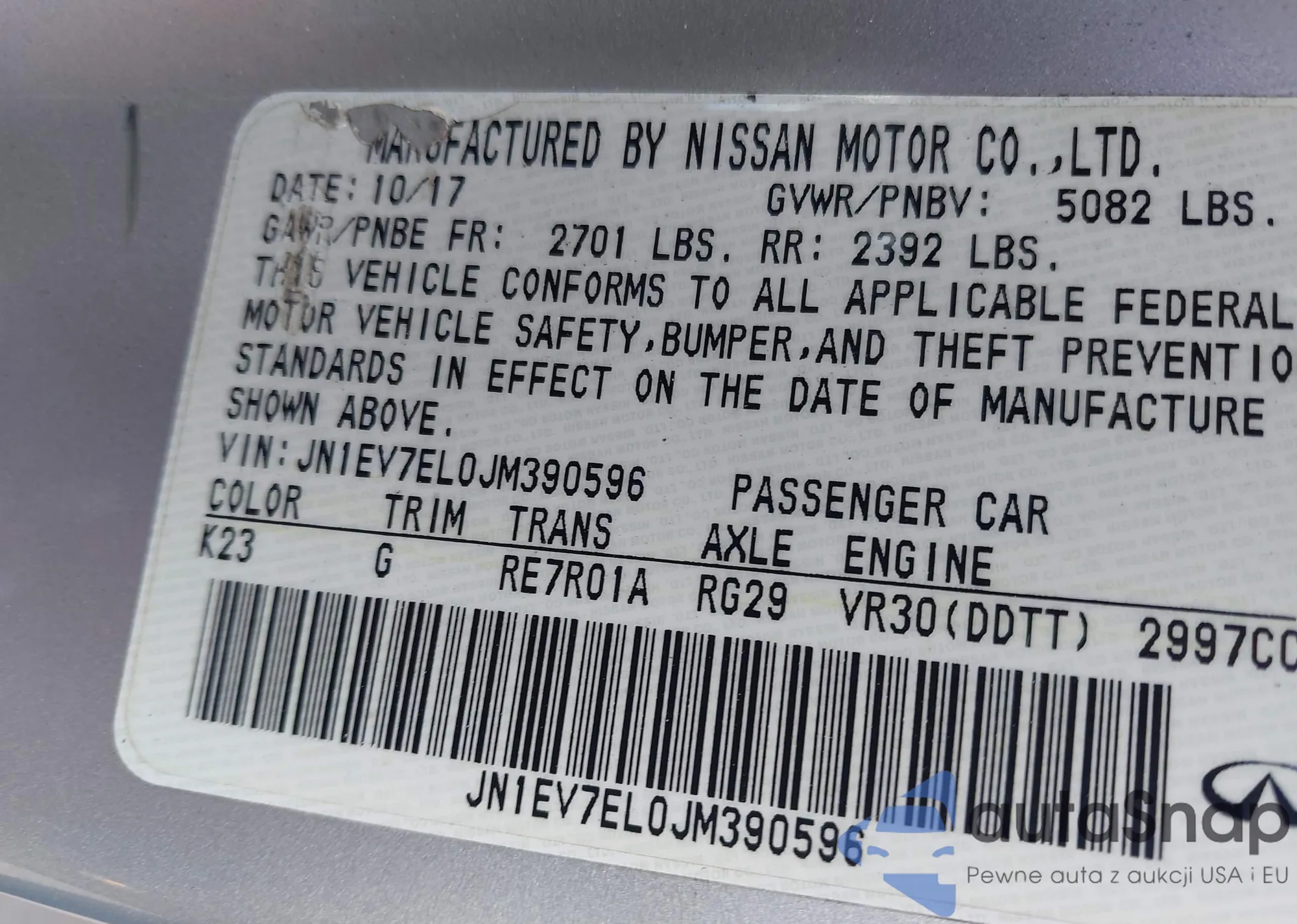 LOT: 43009386 VIN: JN1EV7EL0JM390596