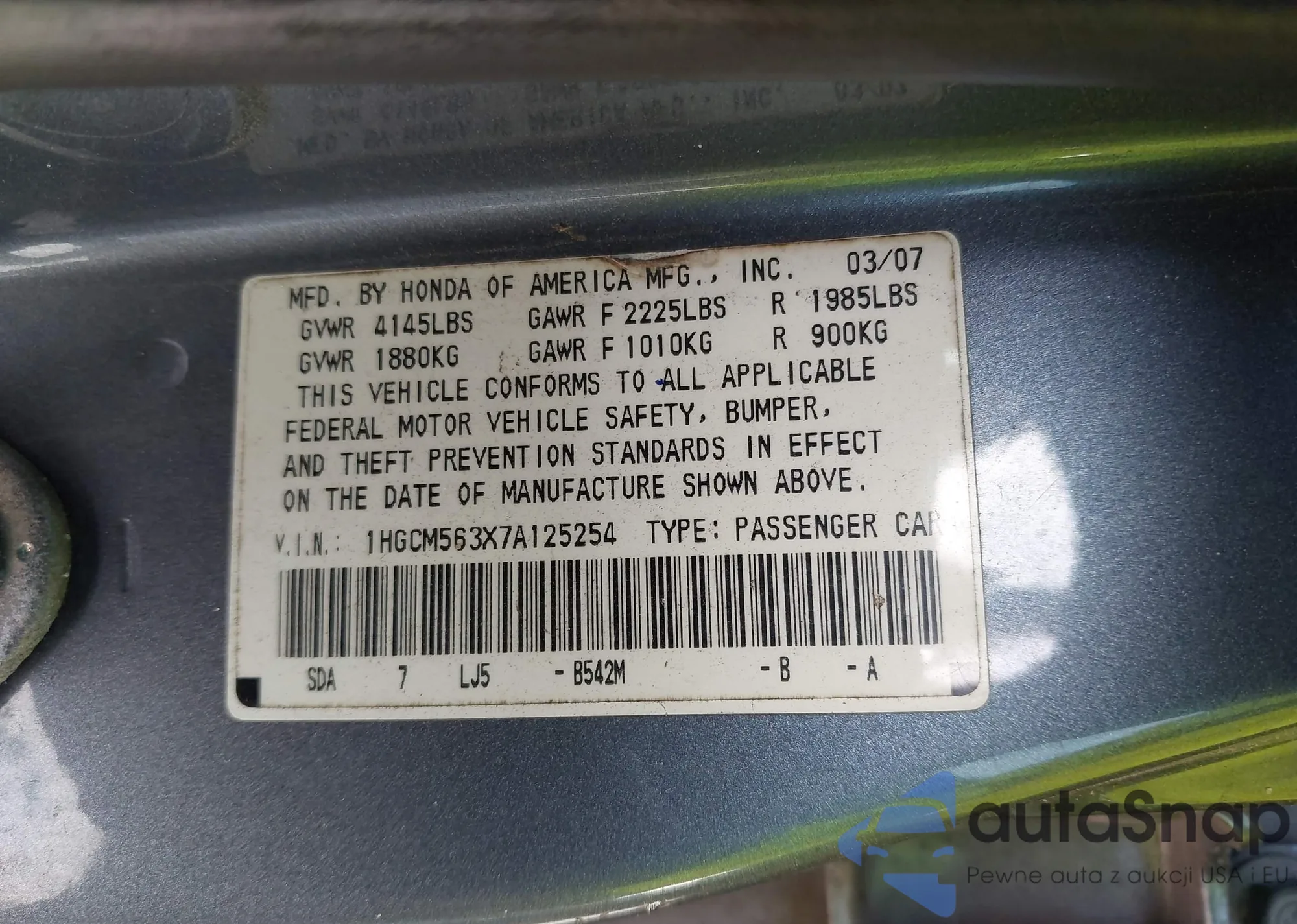 LOT: 43124455 VIN: 1HGCM563X7A125254