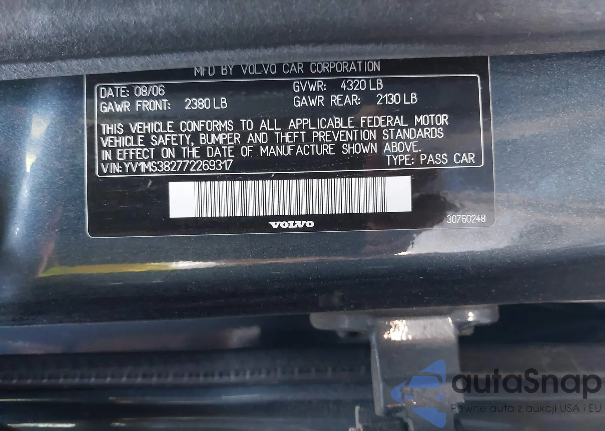 LOT: 43211380 VIN: YV1MS382772269317