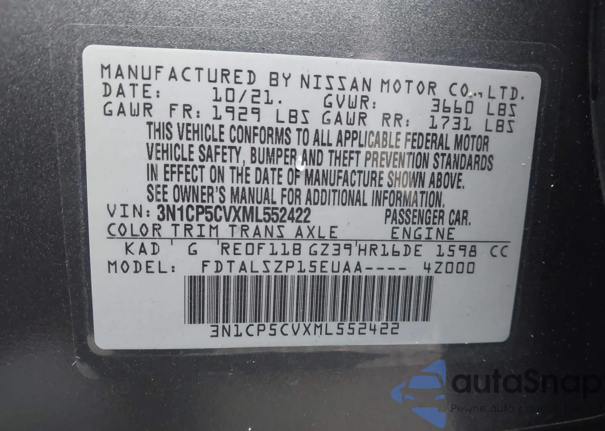 LOT: 43172872 VIN: 3N1CP5CVXML552422