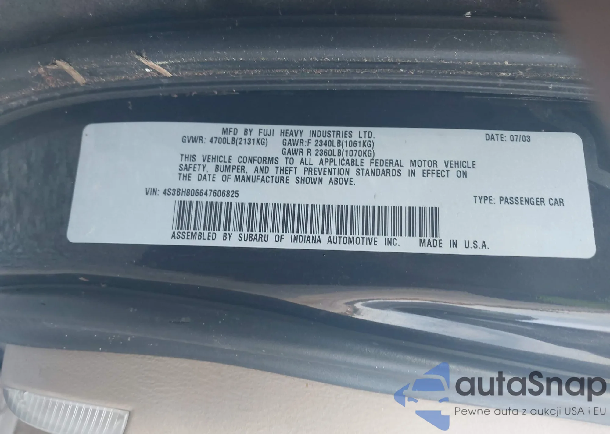 LOT: 43117853 VIN: 4S3BH806647606825