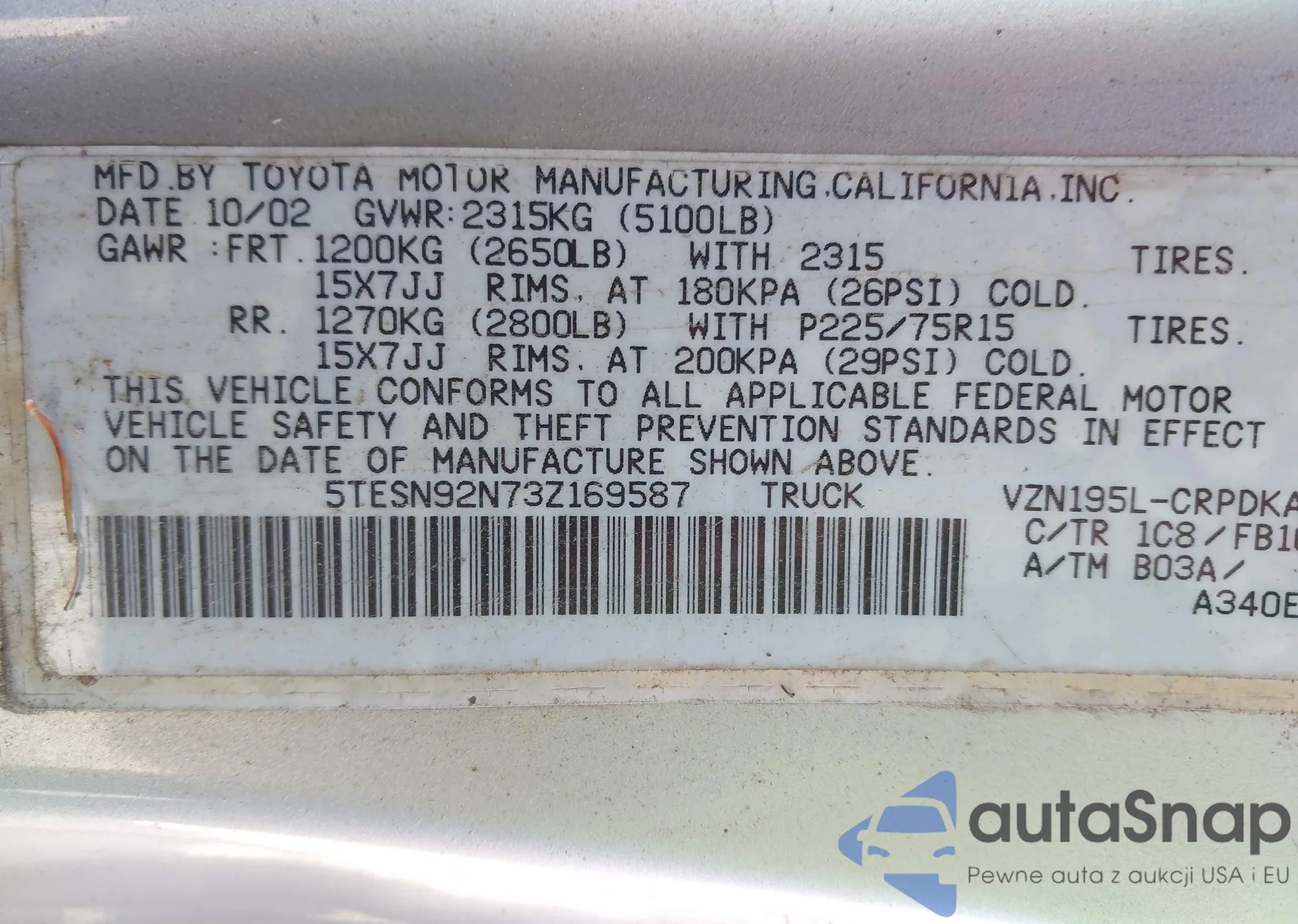 • VIN 5TESN92N73Z169587