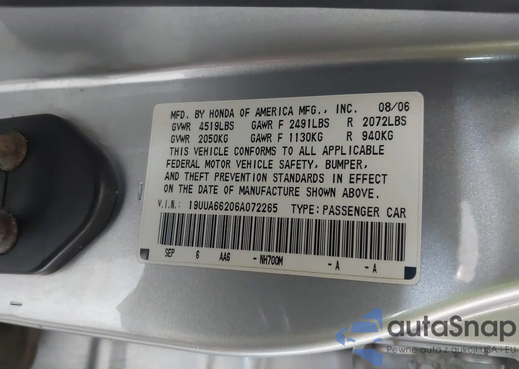 • VIN 19UUA66206A072265
