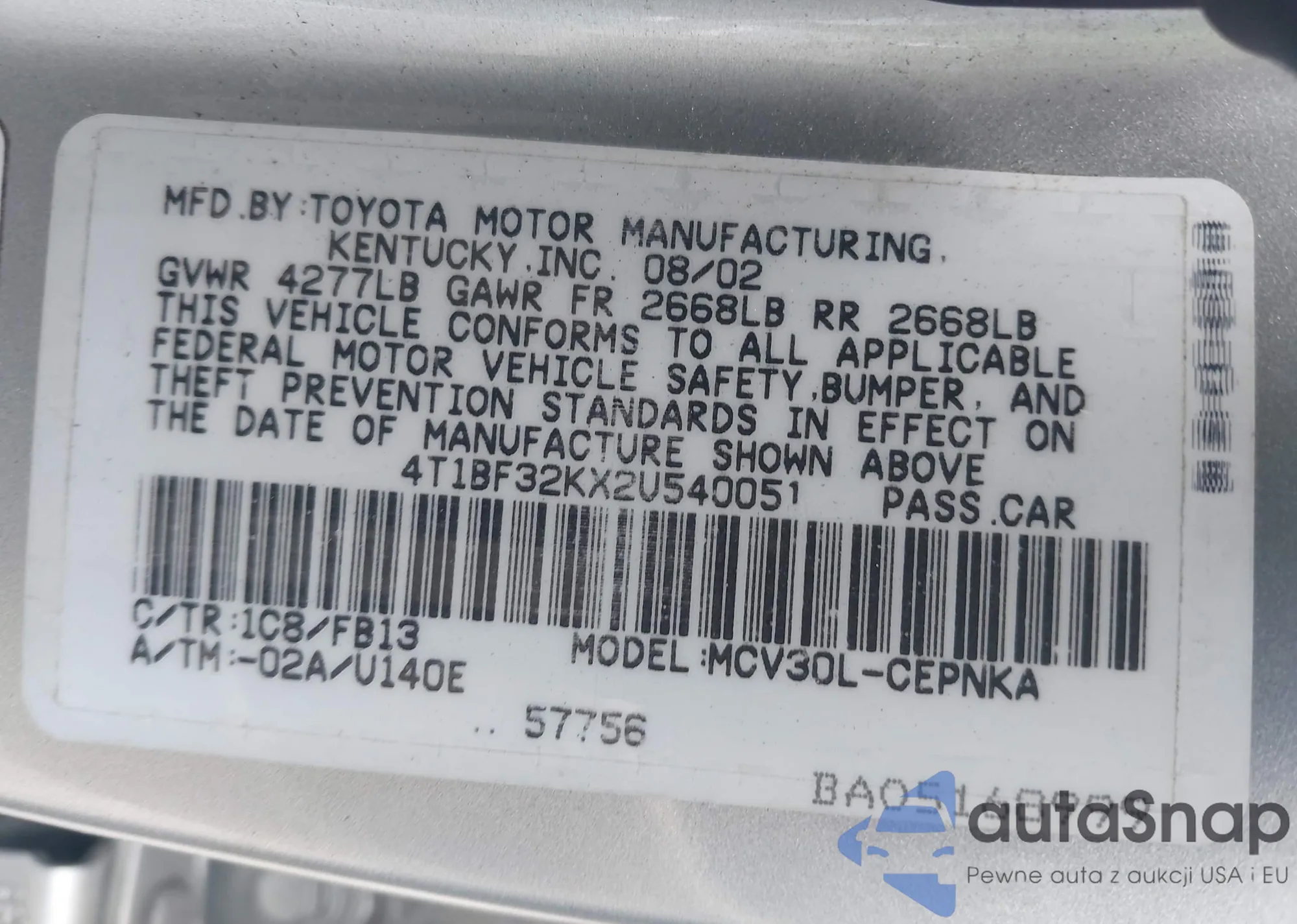 • VIN 4T1BF32KX2U540051