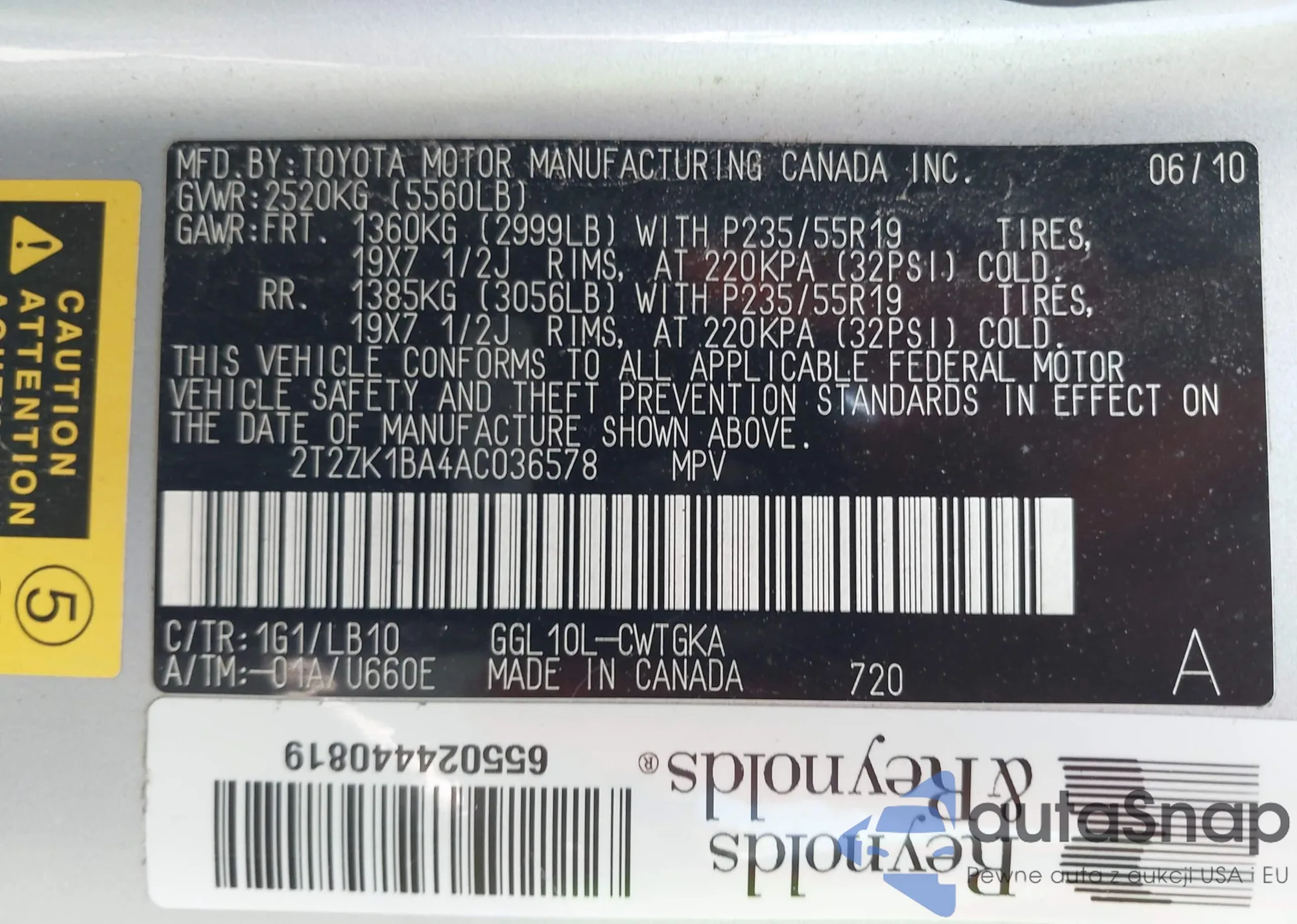 • VIN 2T2ZK1BA4AC036578