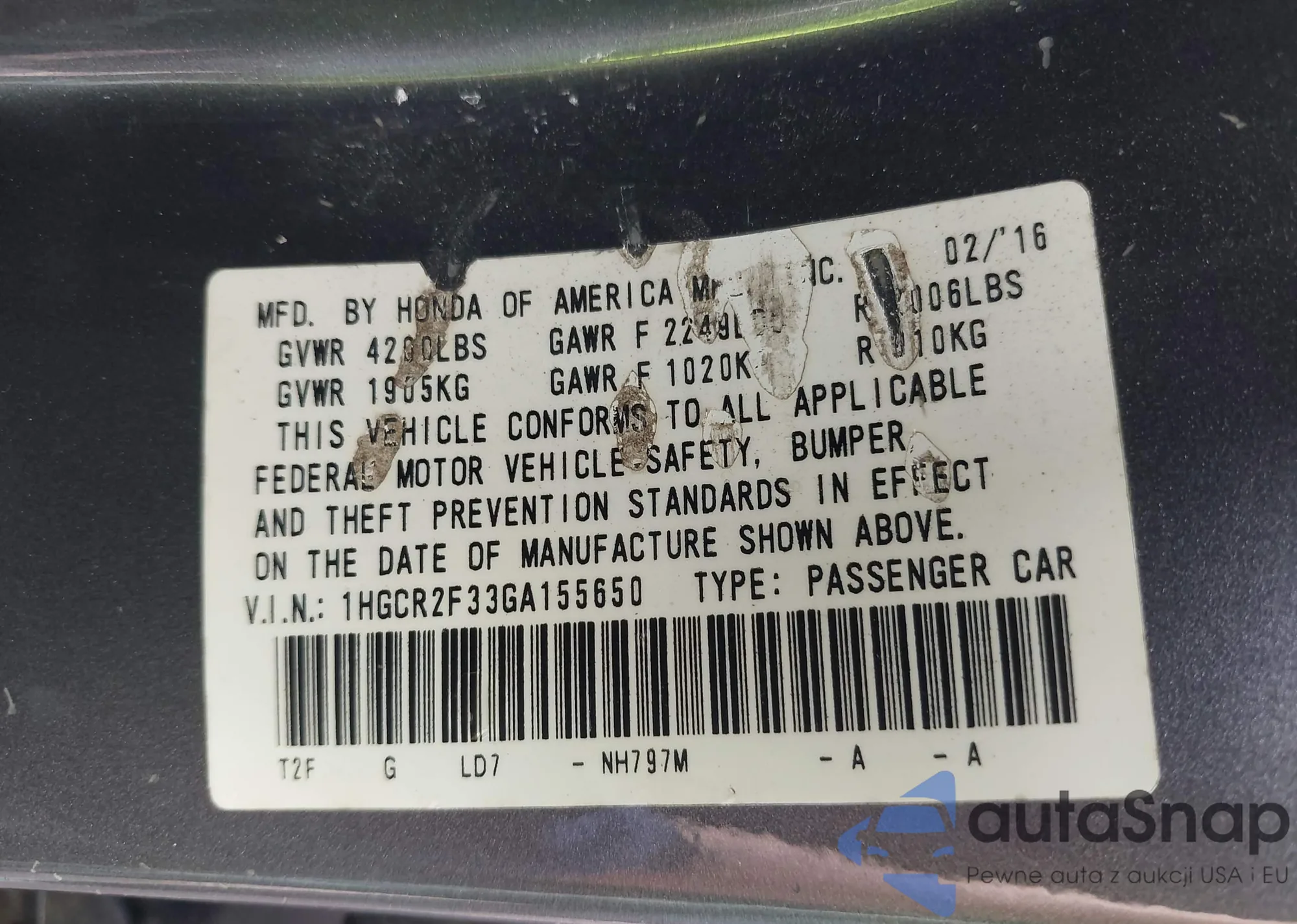 • VIN 1HGCR2F33GA155650