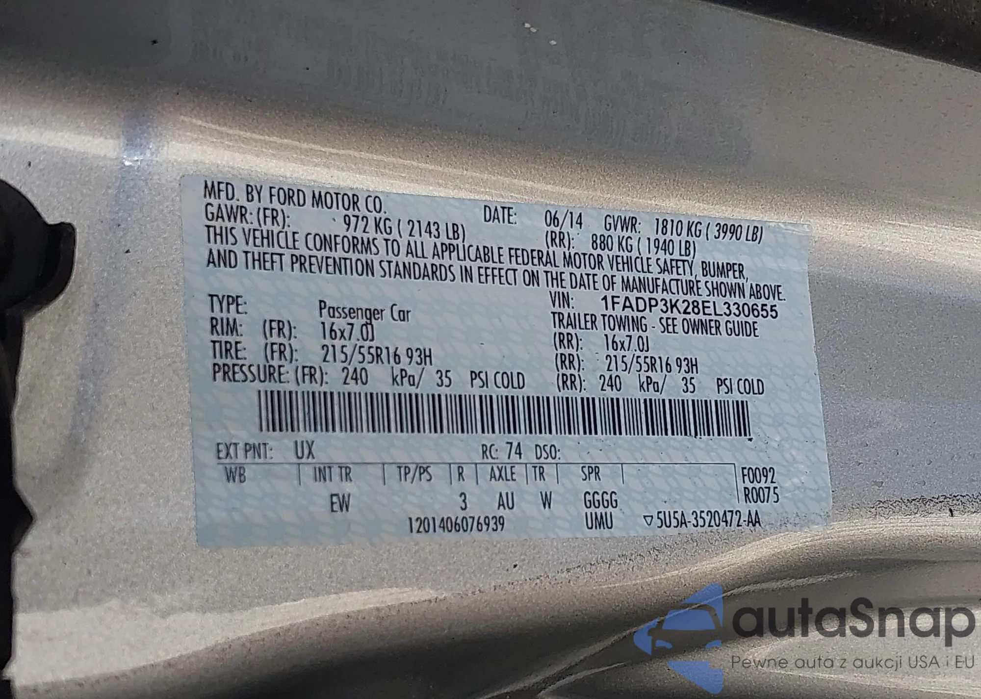 LOT: 43241723 VIN: 1FADP3K28EL330655