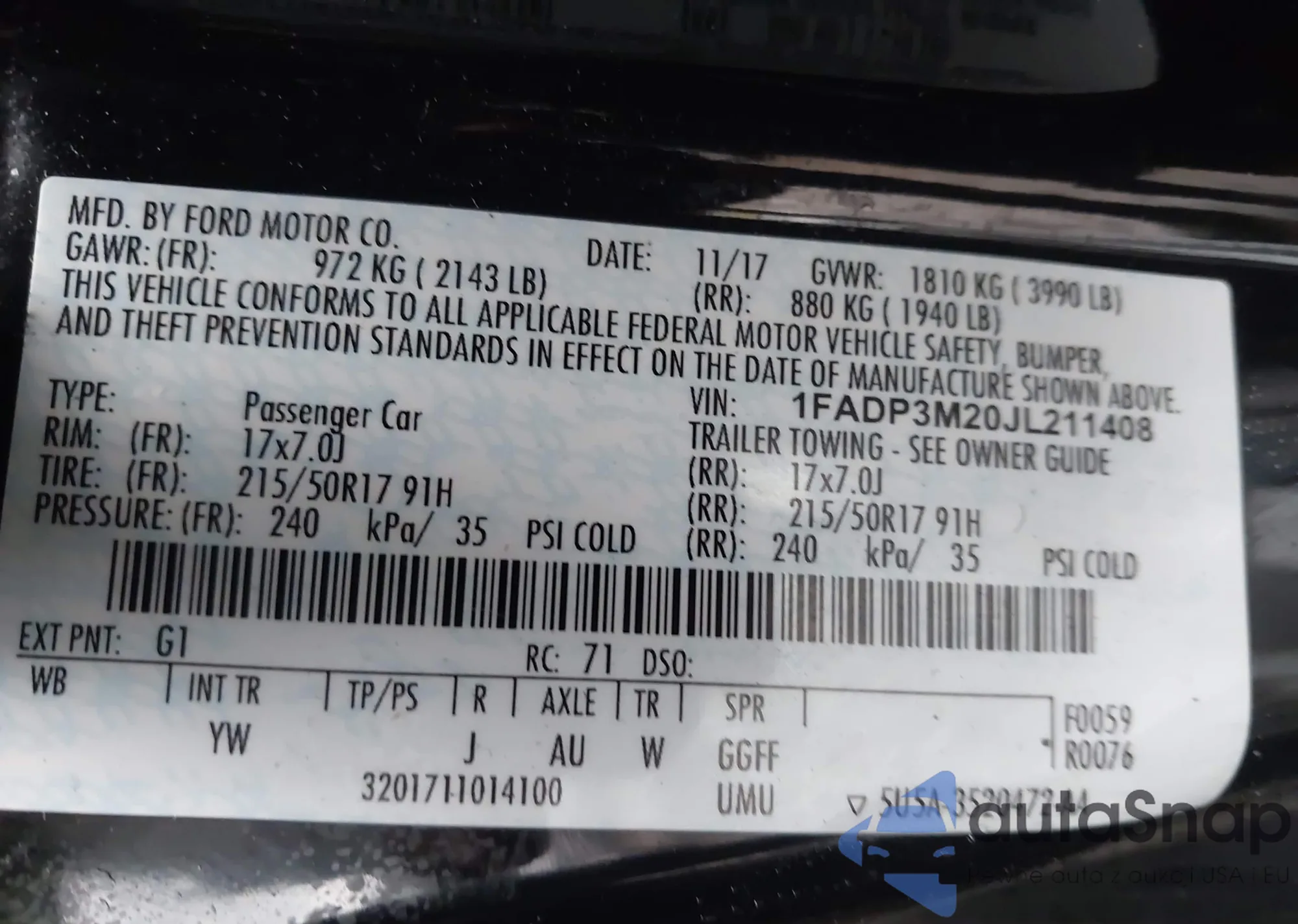 • VIN 1FADP3M20JL211408