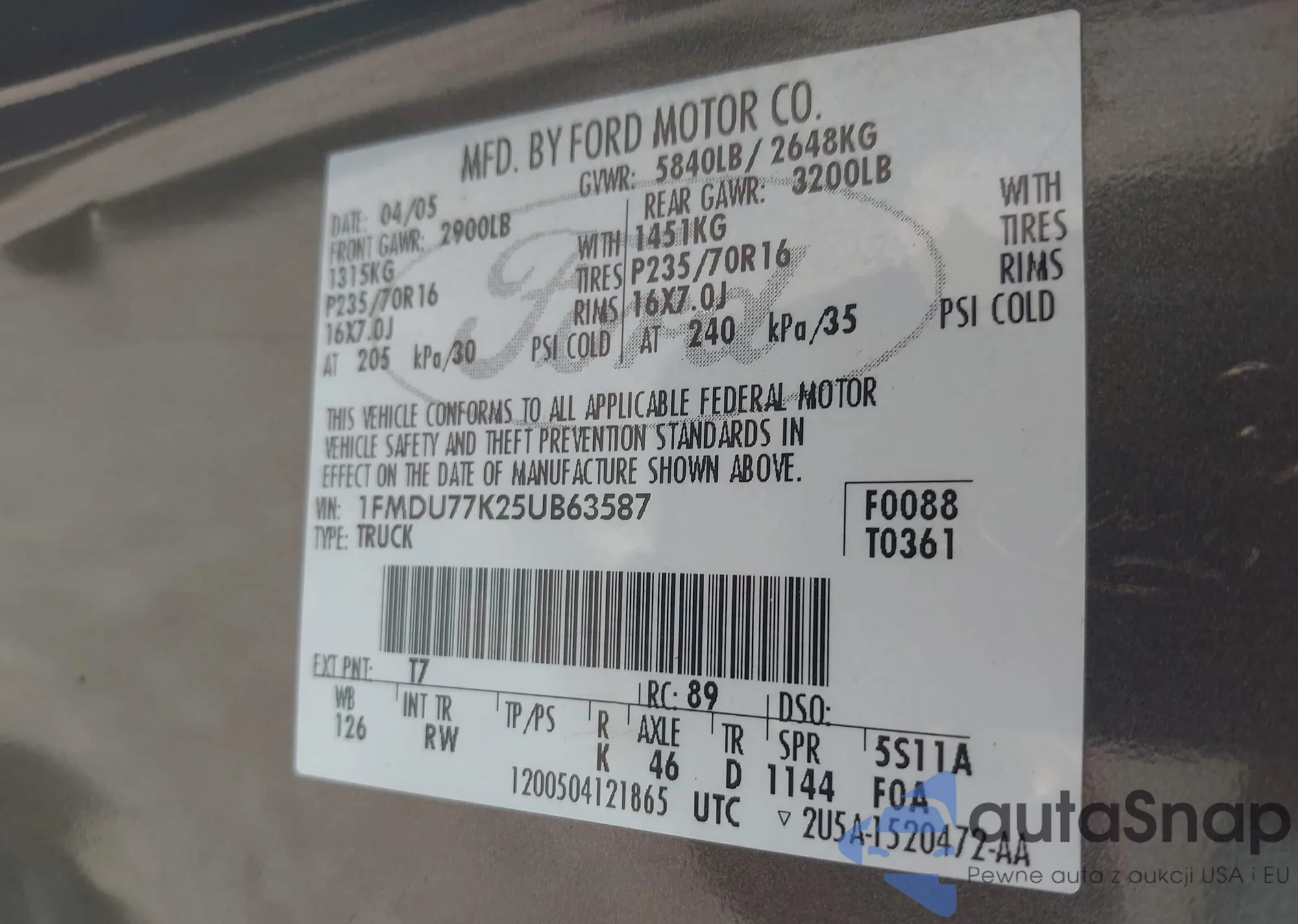 • VIN 1FMDU77K25UB63187