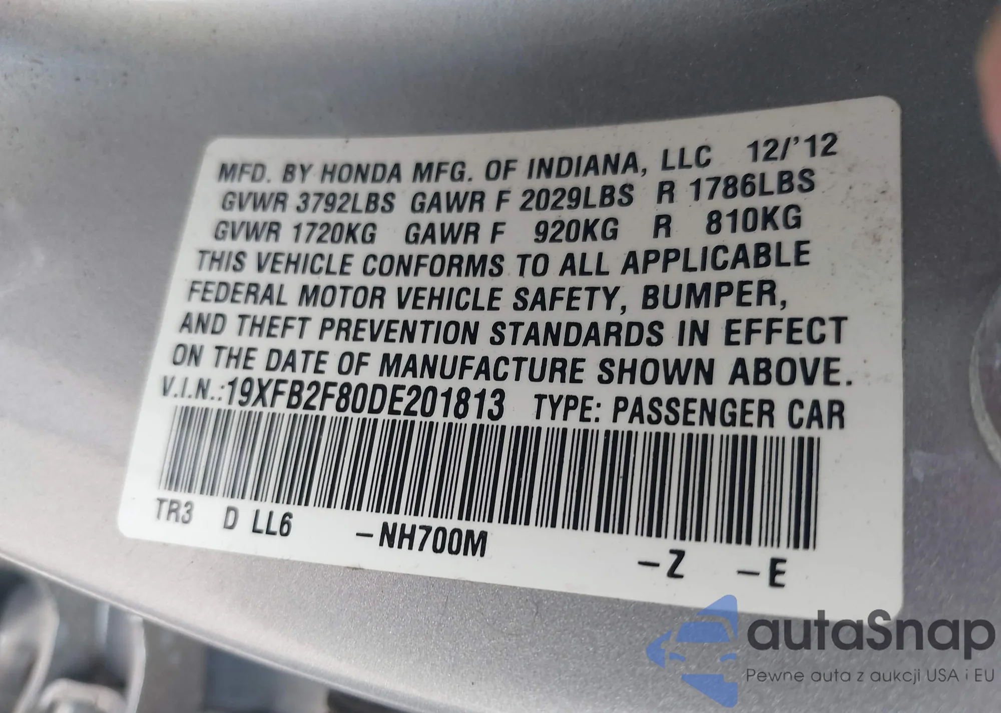 LOT: 42114880 VIN: 19XFB2F80DE201813