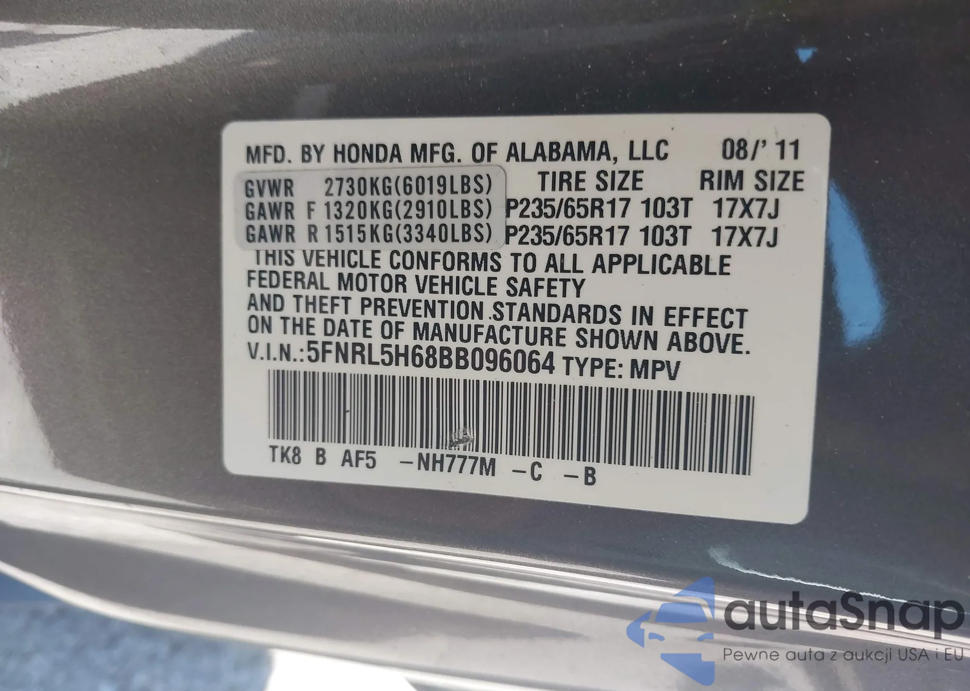 • VIN 5J6RM4H39EL061185