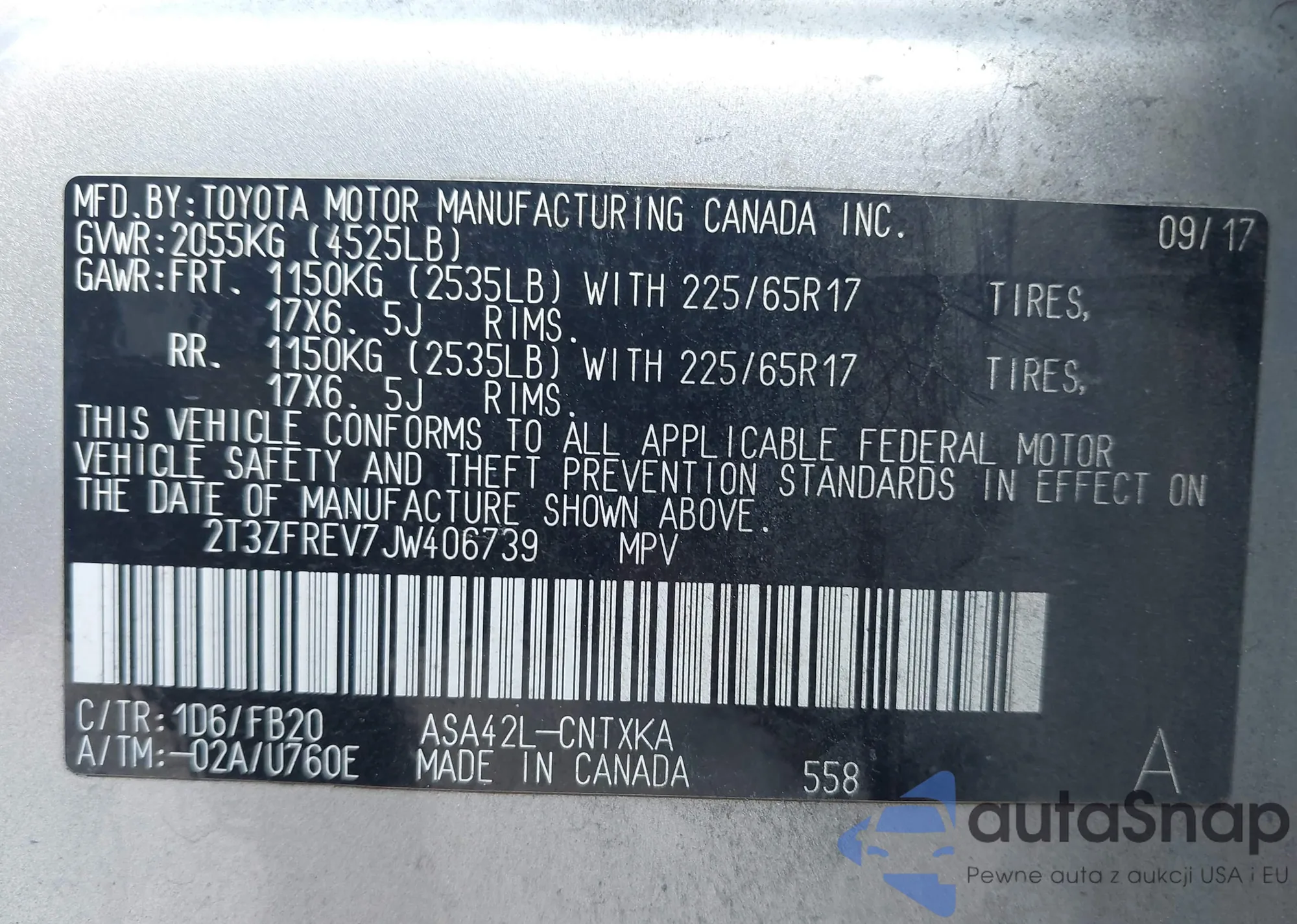 • VIN 2T3ZFREV7JW406739