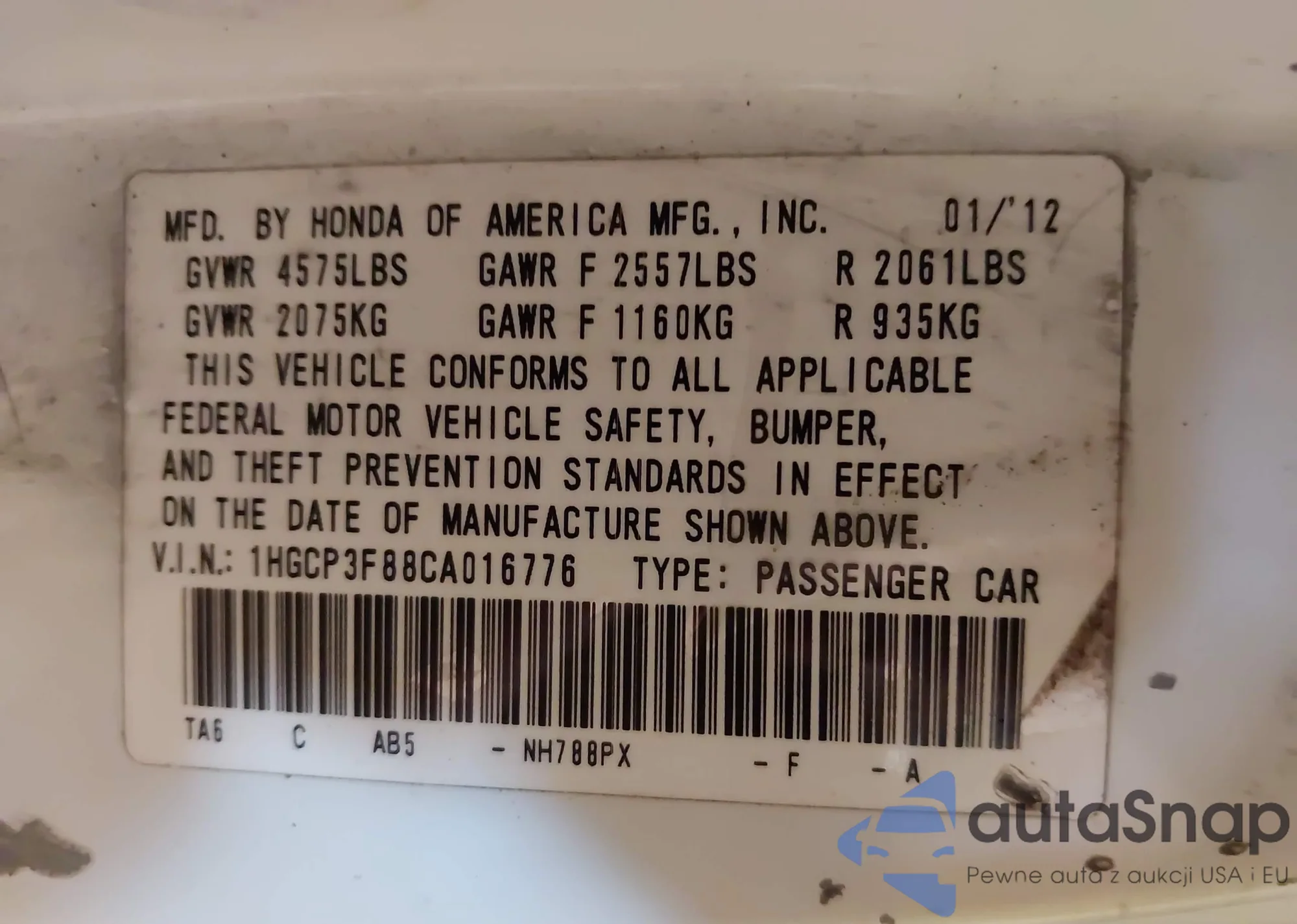 • VIN 1HGCP3F88CA016776