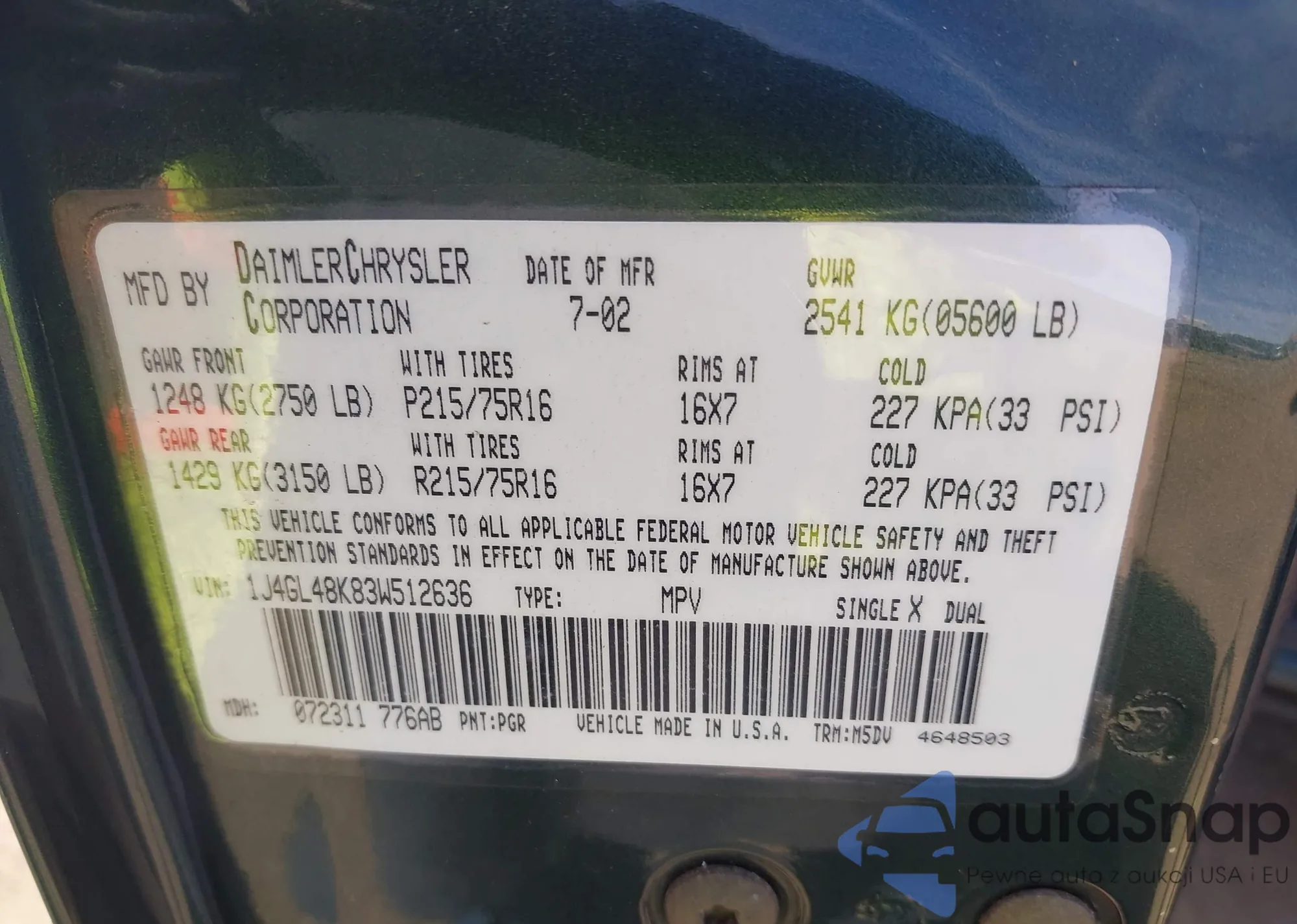 • VIN 1J4GL48K83W512636