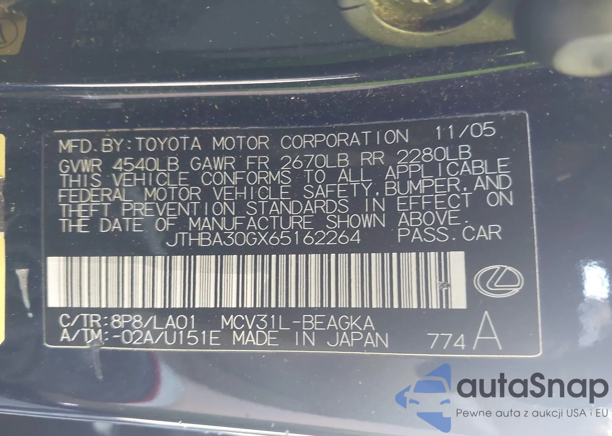• VIN JTHBA30GX65162264