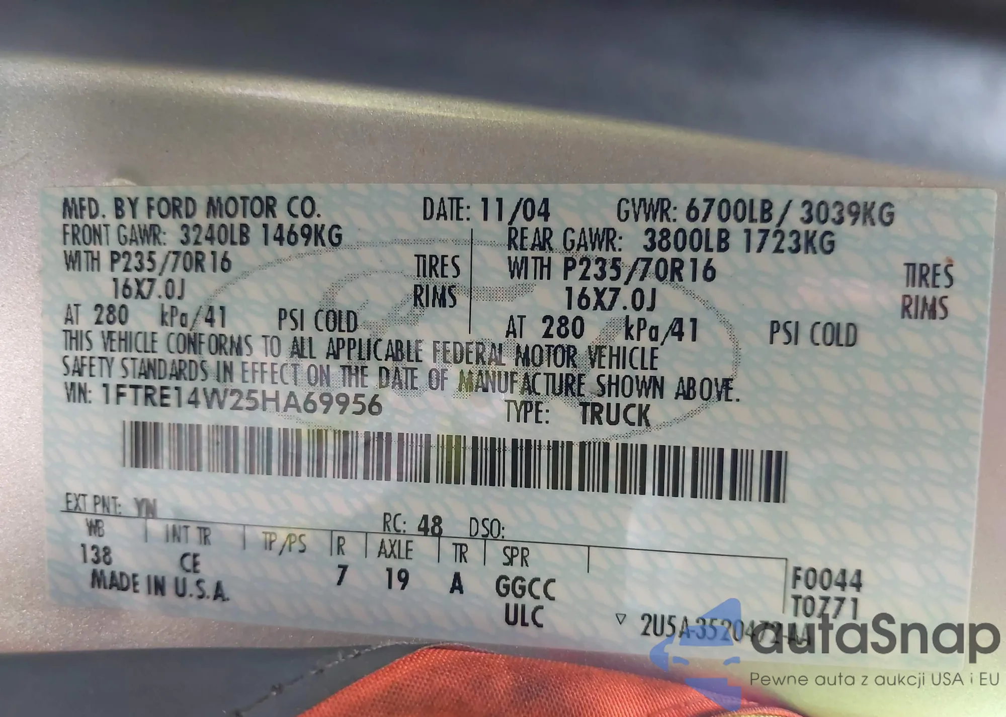 LOT: 43204796 VIN: 1FTRE14W25HA69956