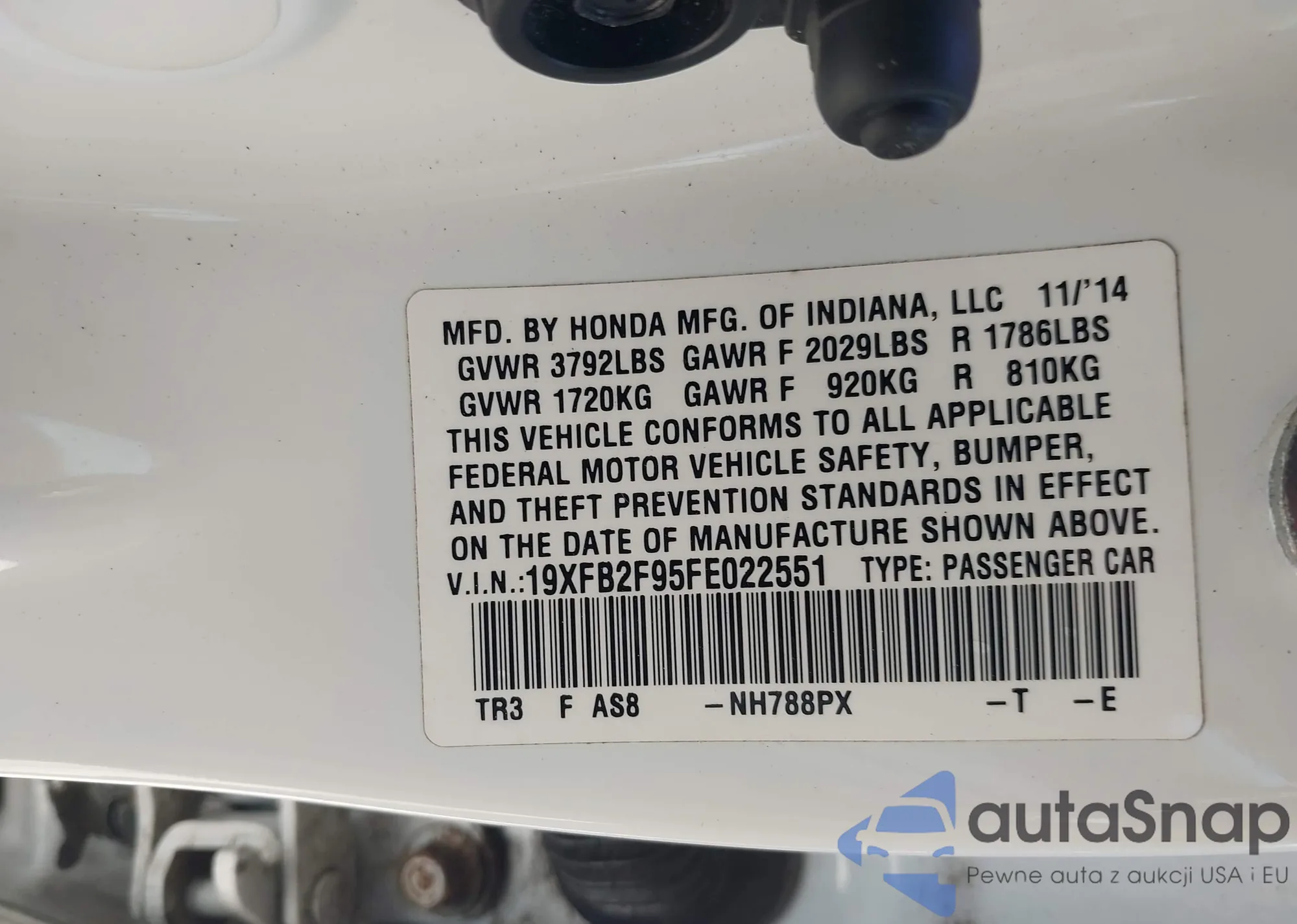 LOT: 42862946 VIN: 2HGFE2F58NH500468