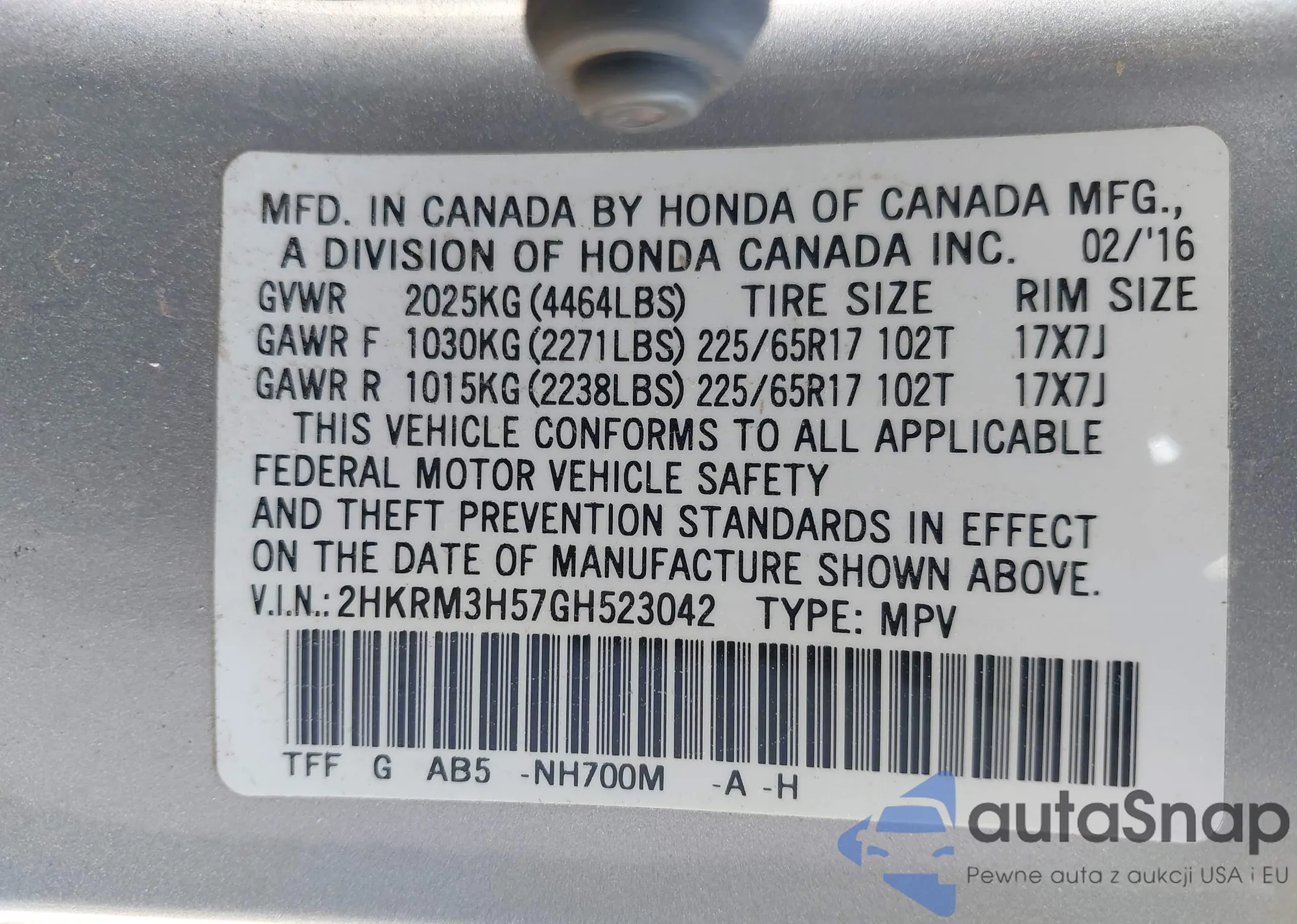 • VIN 2HKRM3H57GH523042