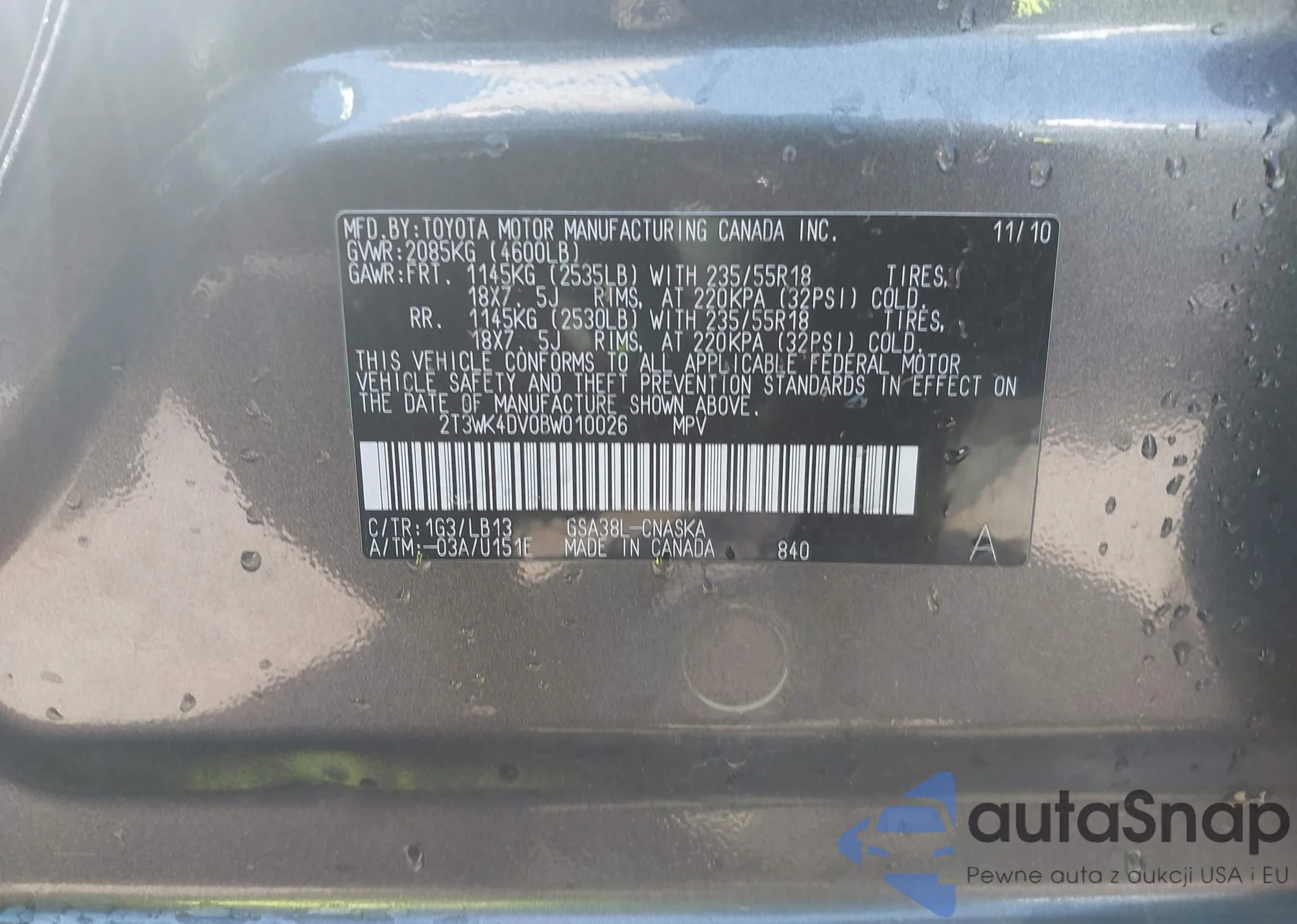LOT: 43159281 VIN: 2T3WK4DV0BW010026