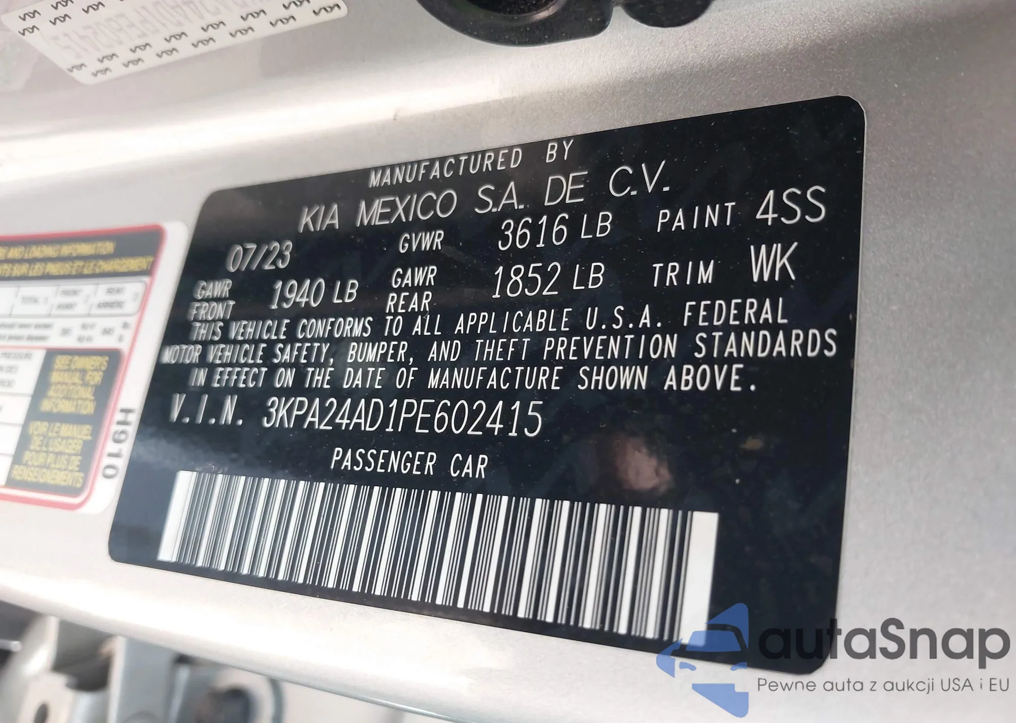 LOT: 43207101 VIN: 3KPA24AD1PE602415