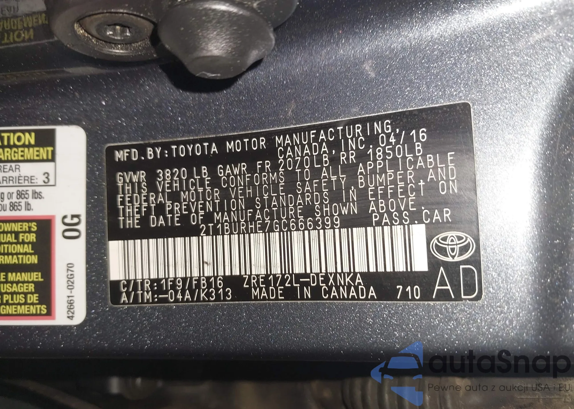 LOT: 42366941 VIN: 2T1BURHE7GC666399