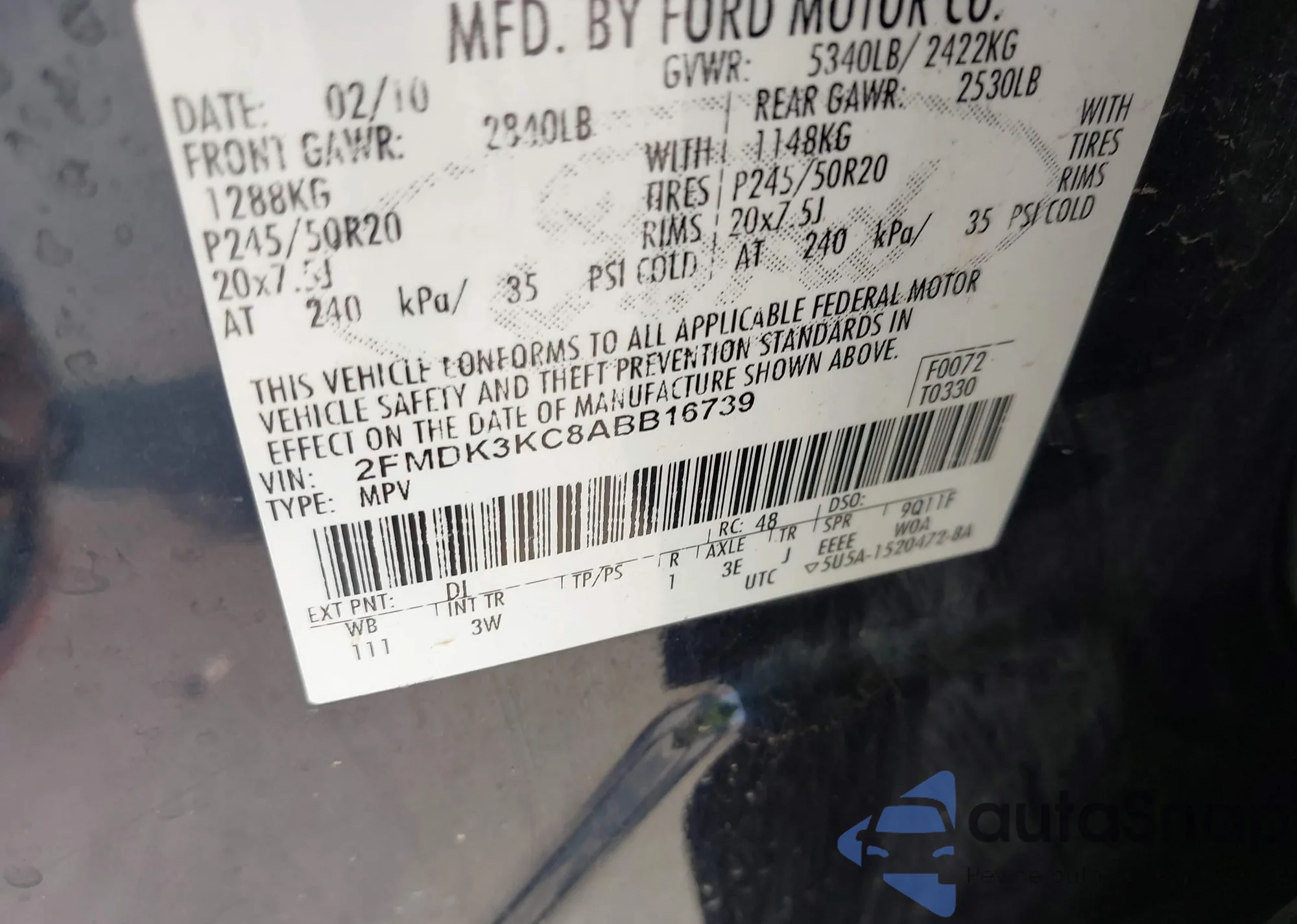 • VIN 2FMDK3KC8ABB16739
