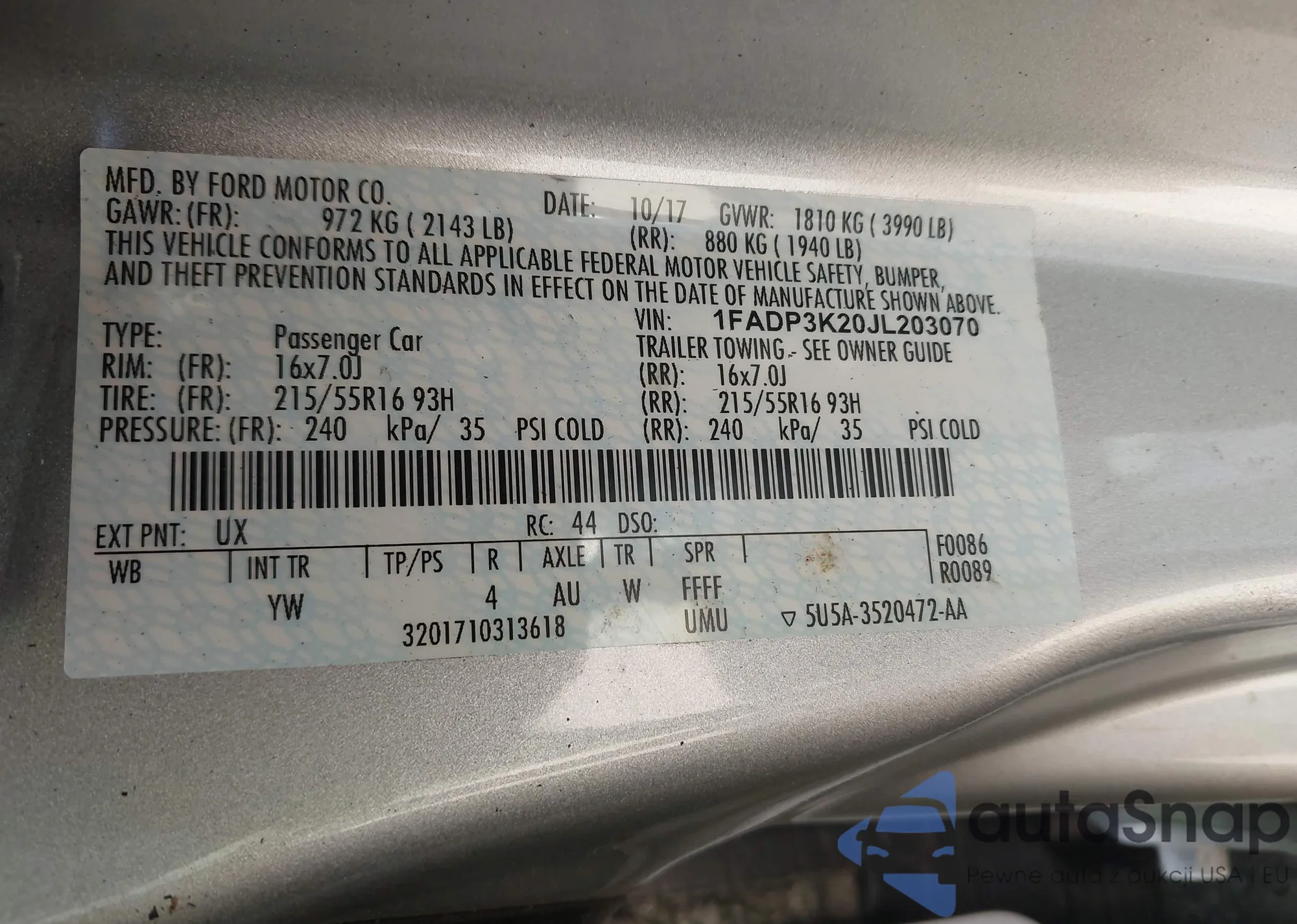 LOT: 43274703 VIN: 1FADP3K20JL203070