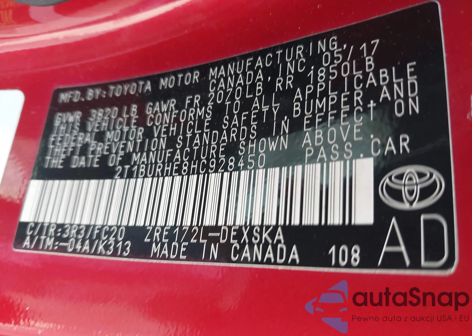 LOT: 42805571 VIN: 2T1BURHE8HC928450