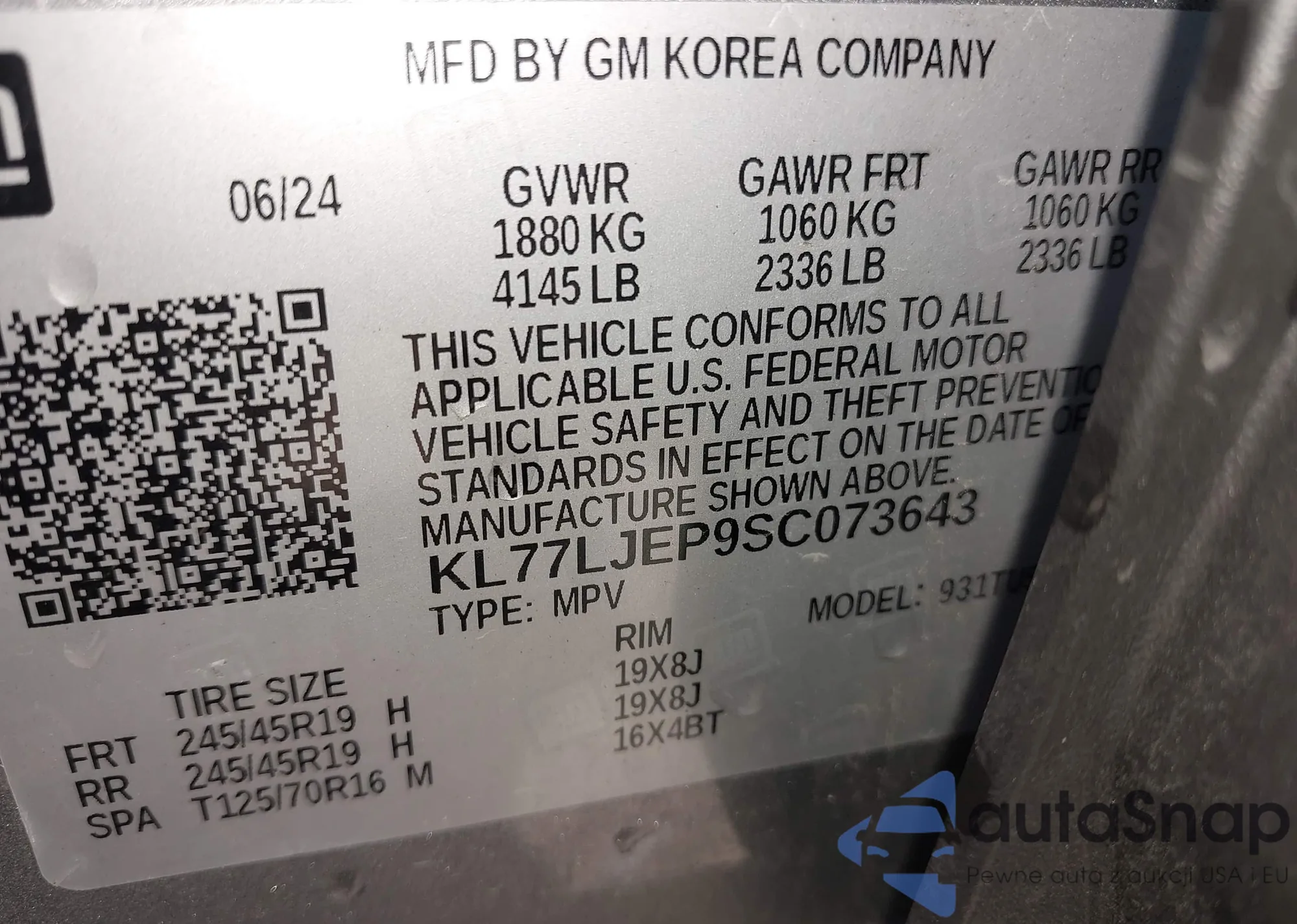 • VIN KL77LJEP9SC073643