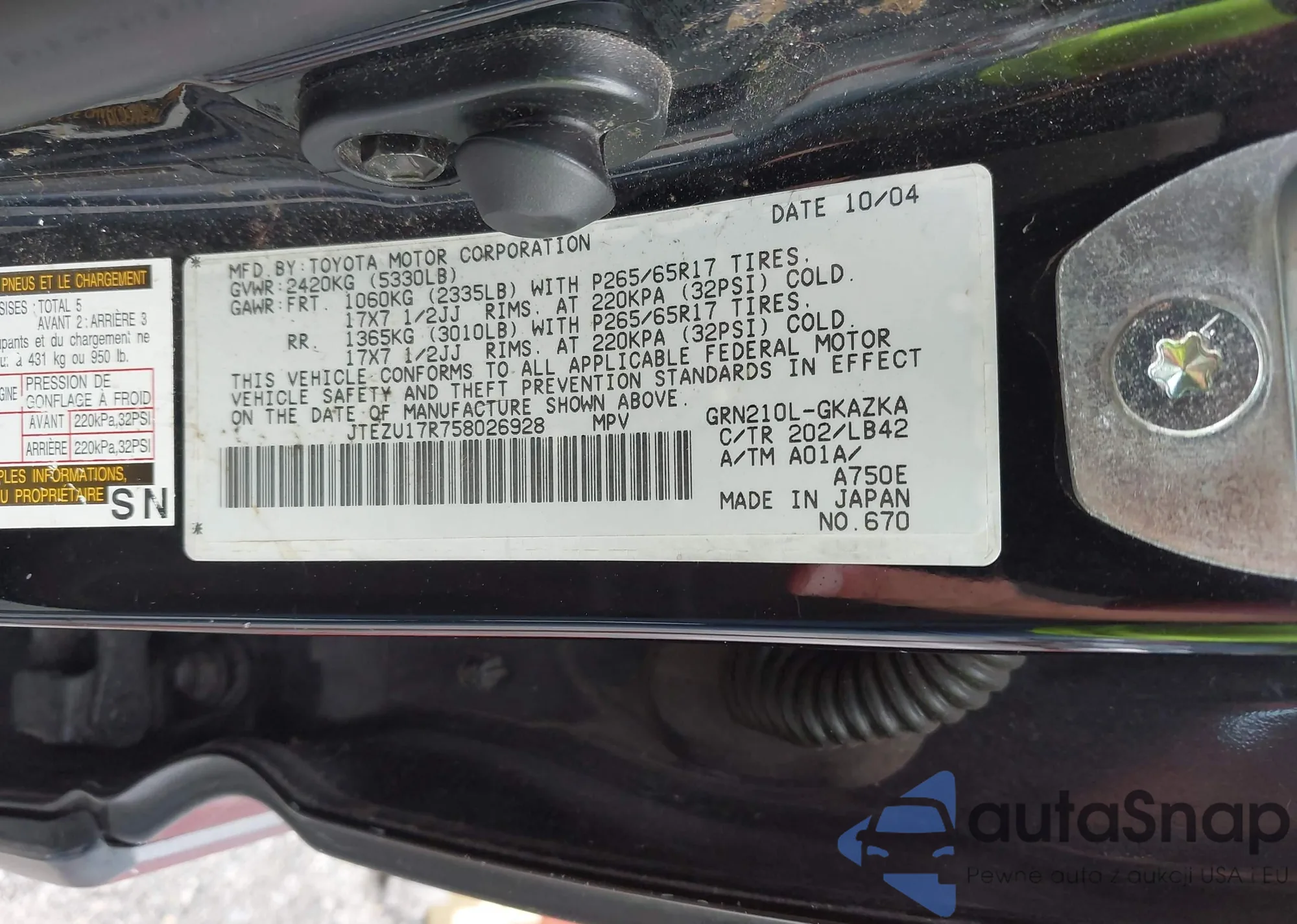 LOT: 43033112 VIN: JTEZU17R758026928