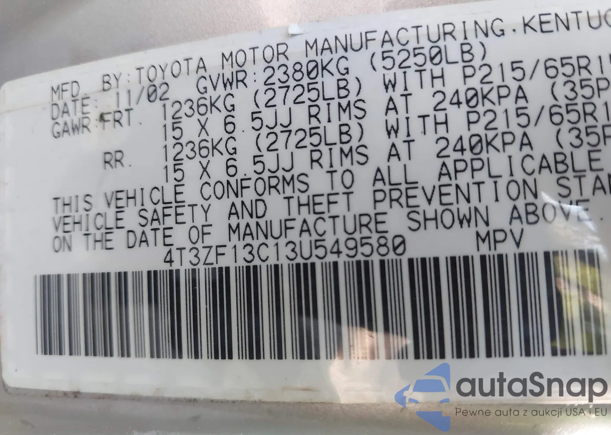 LOT: 43074027 VIN: 4T3ZF13C13U549580