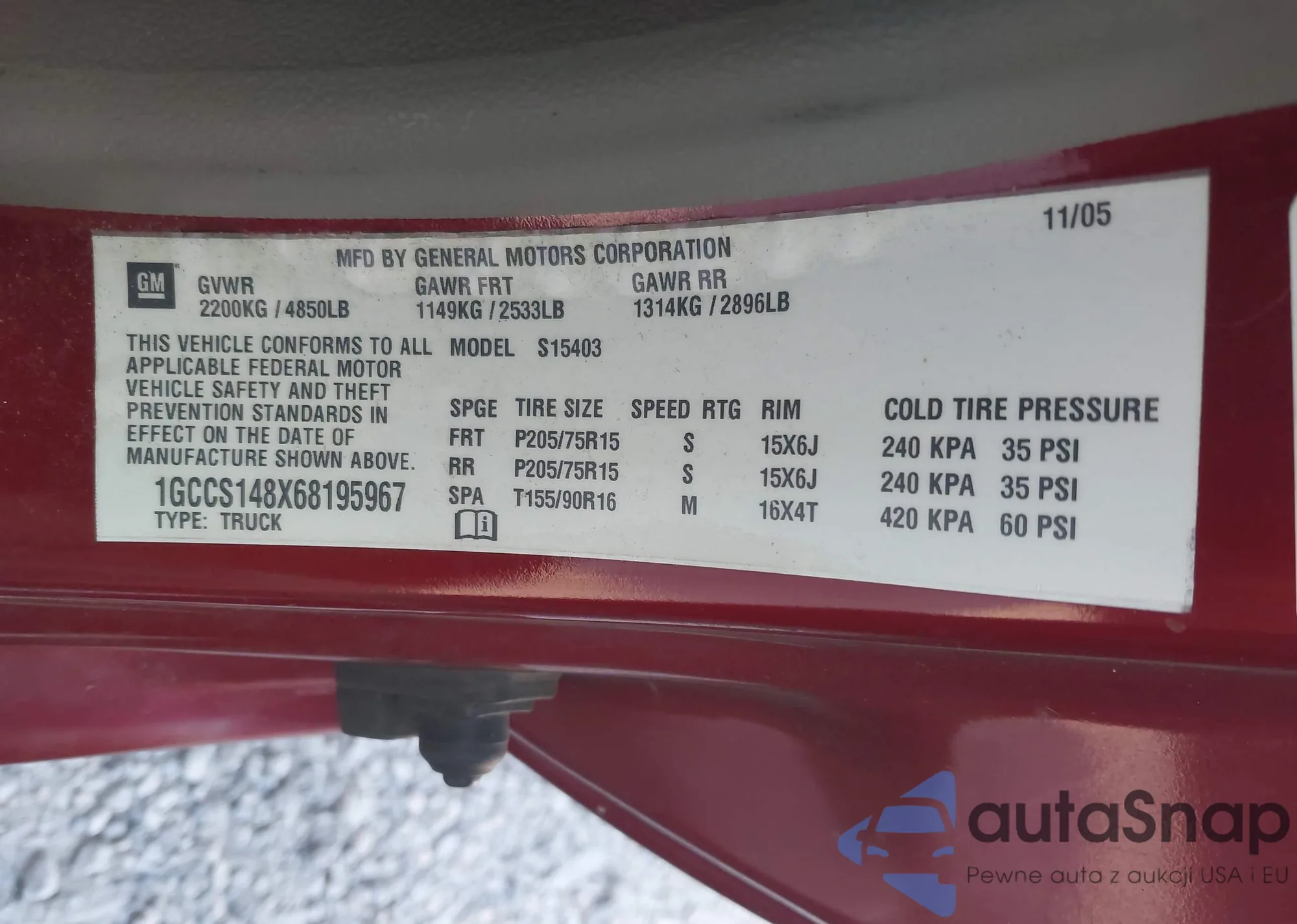 • VIN 1GCCS148X68195967