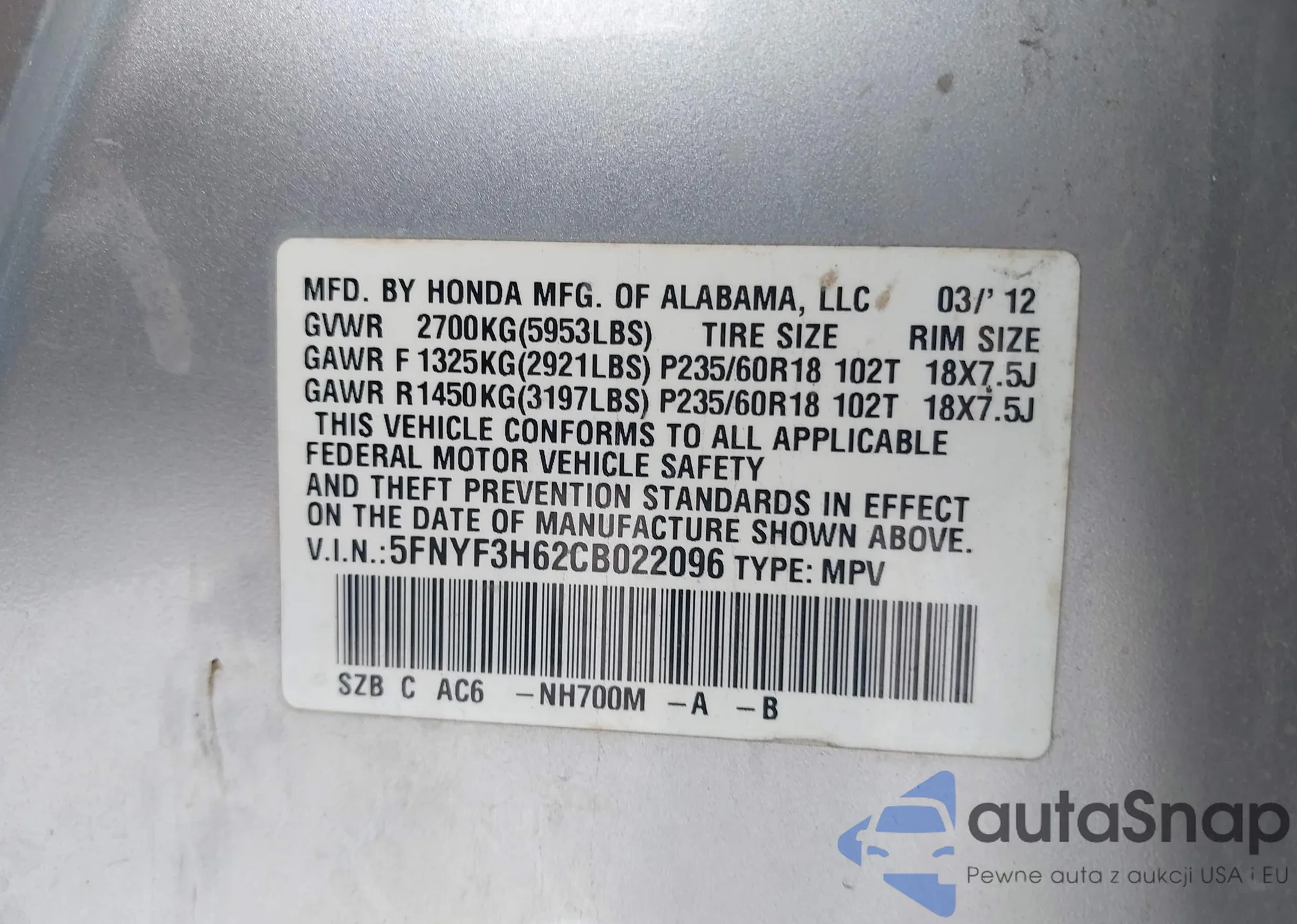 • VIN 5FNYF3H62CB022096