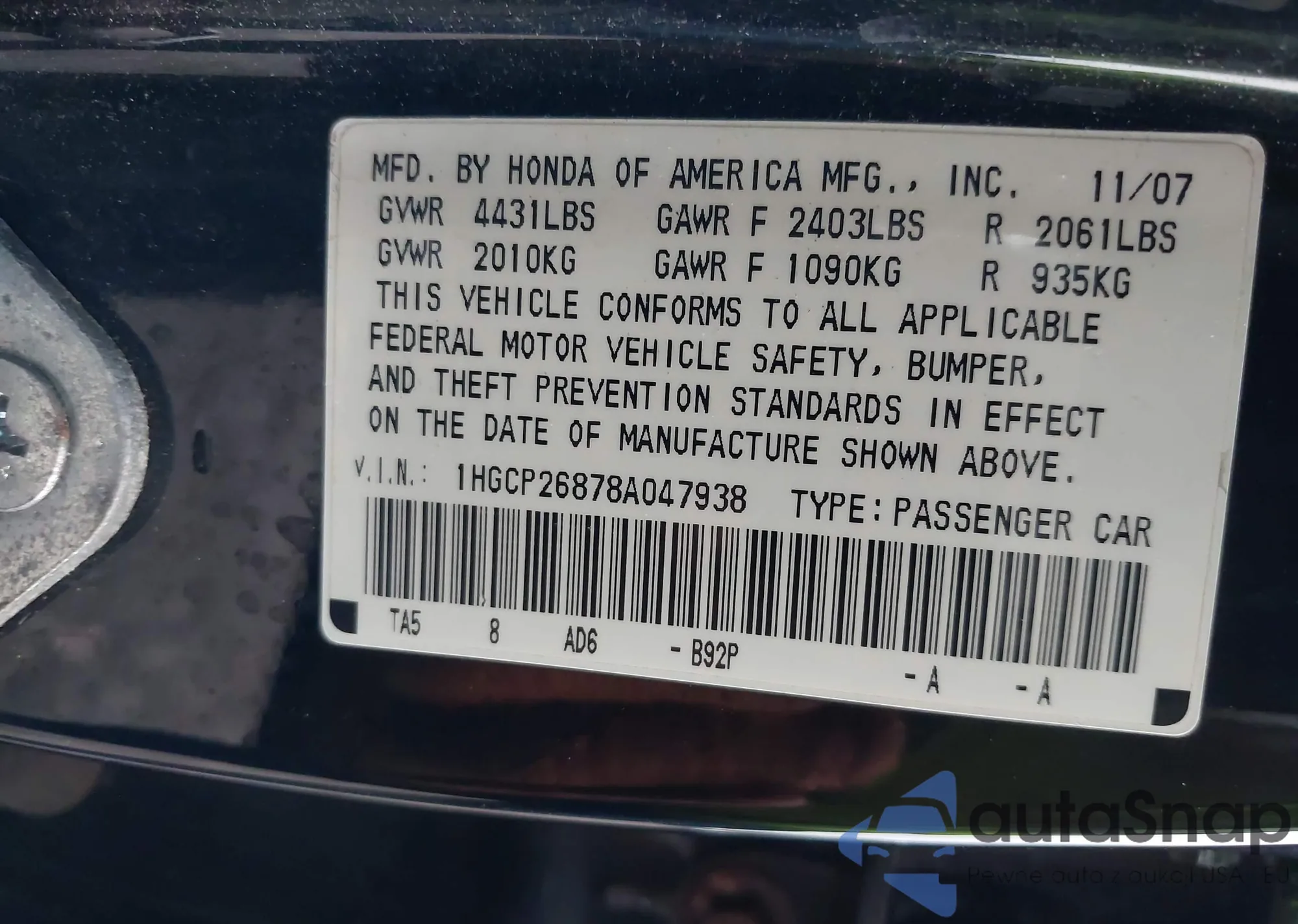 LOT: 43305246 VIN: 1HGCP26878A047938