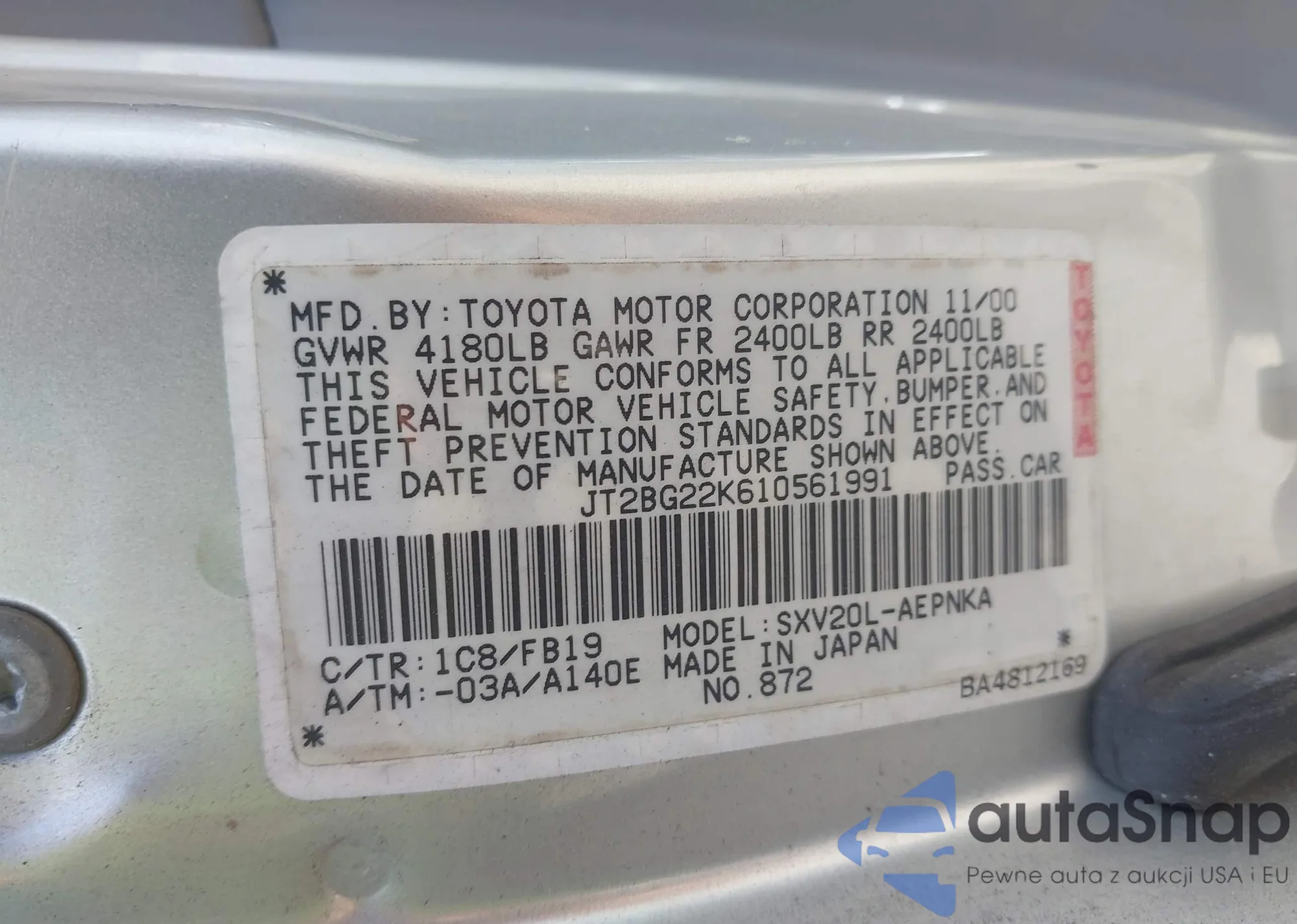 LOT: 42746275 VIN: JT2BG22K610561991