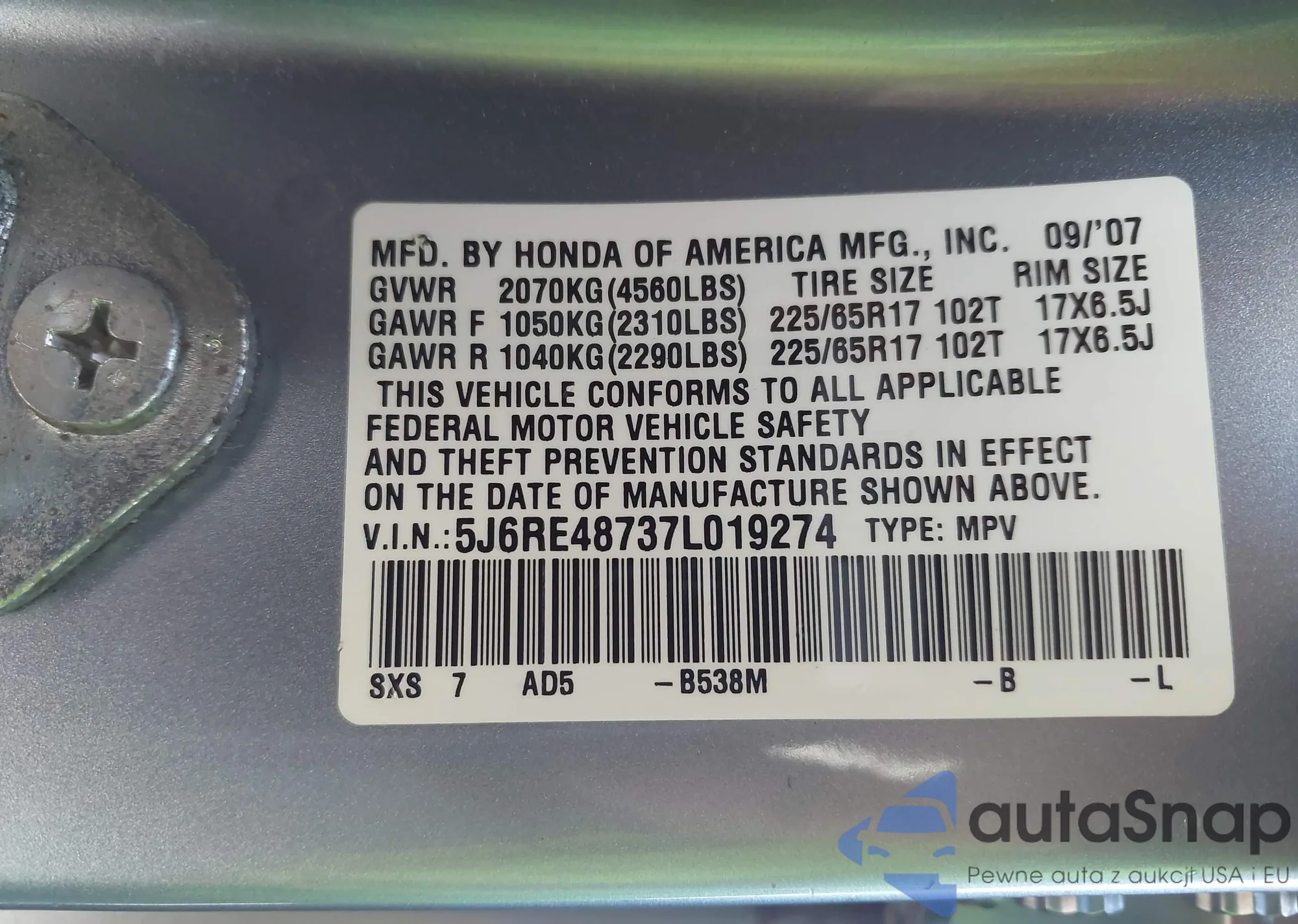 • VIN 5J6RE48737L019274