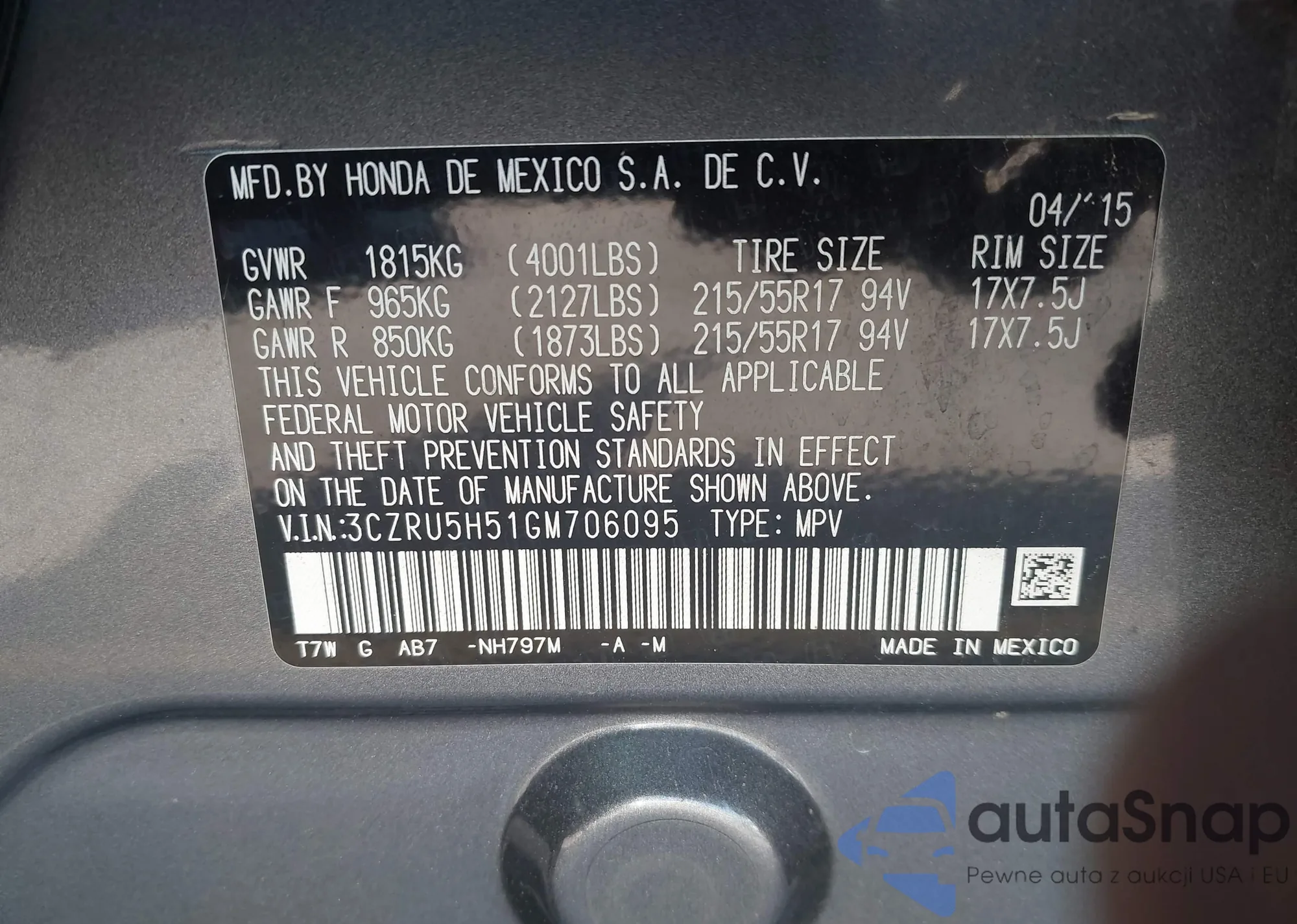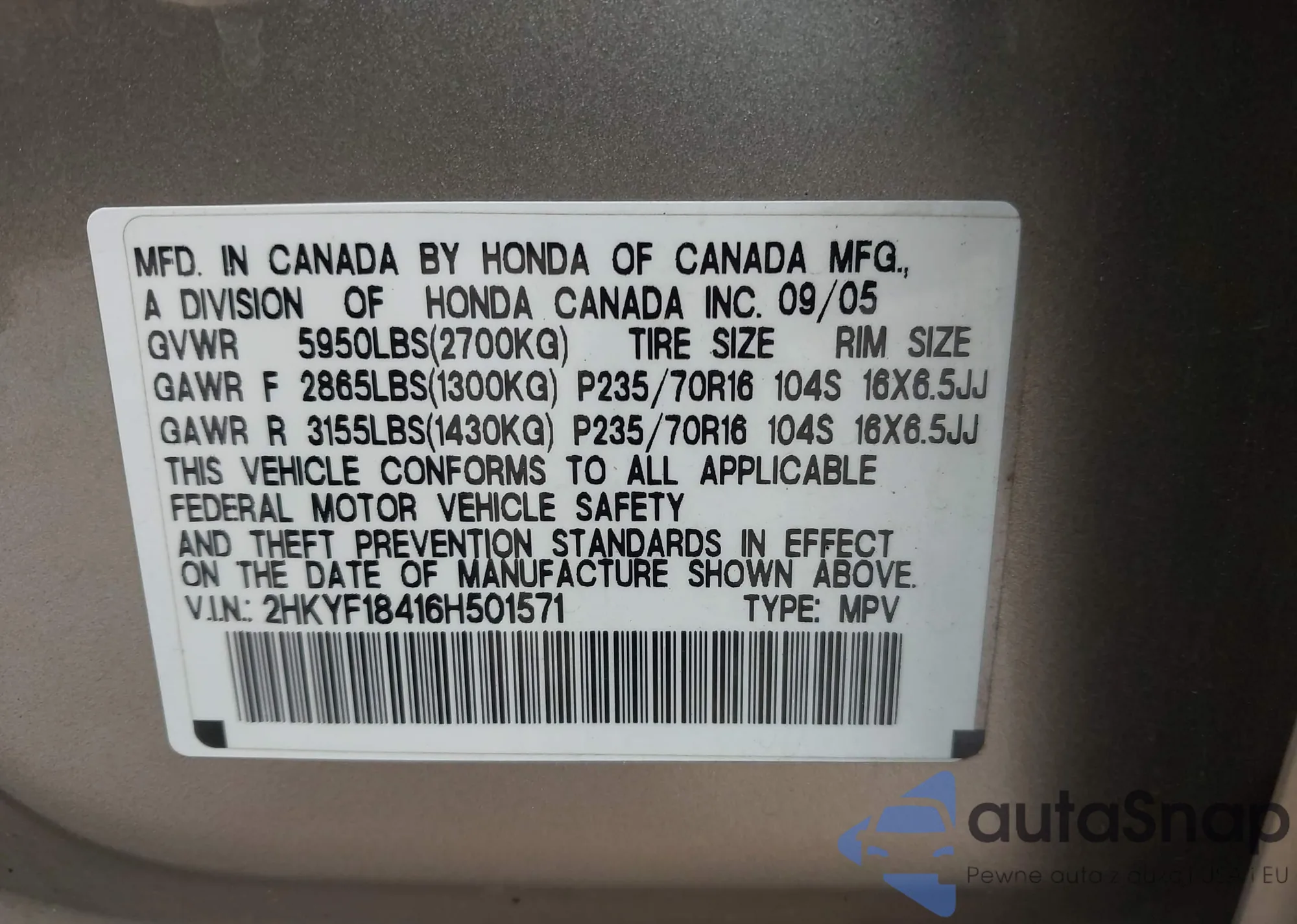 • VIN 5FNYF8H56PB009779