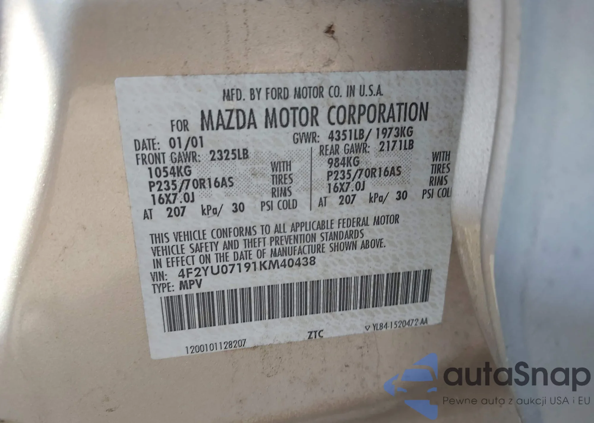 LOT: 42993841 VIN: 4F2YU07191KM40438