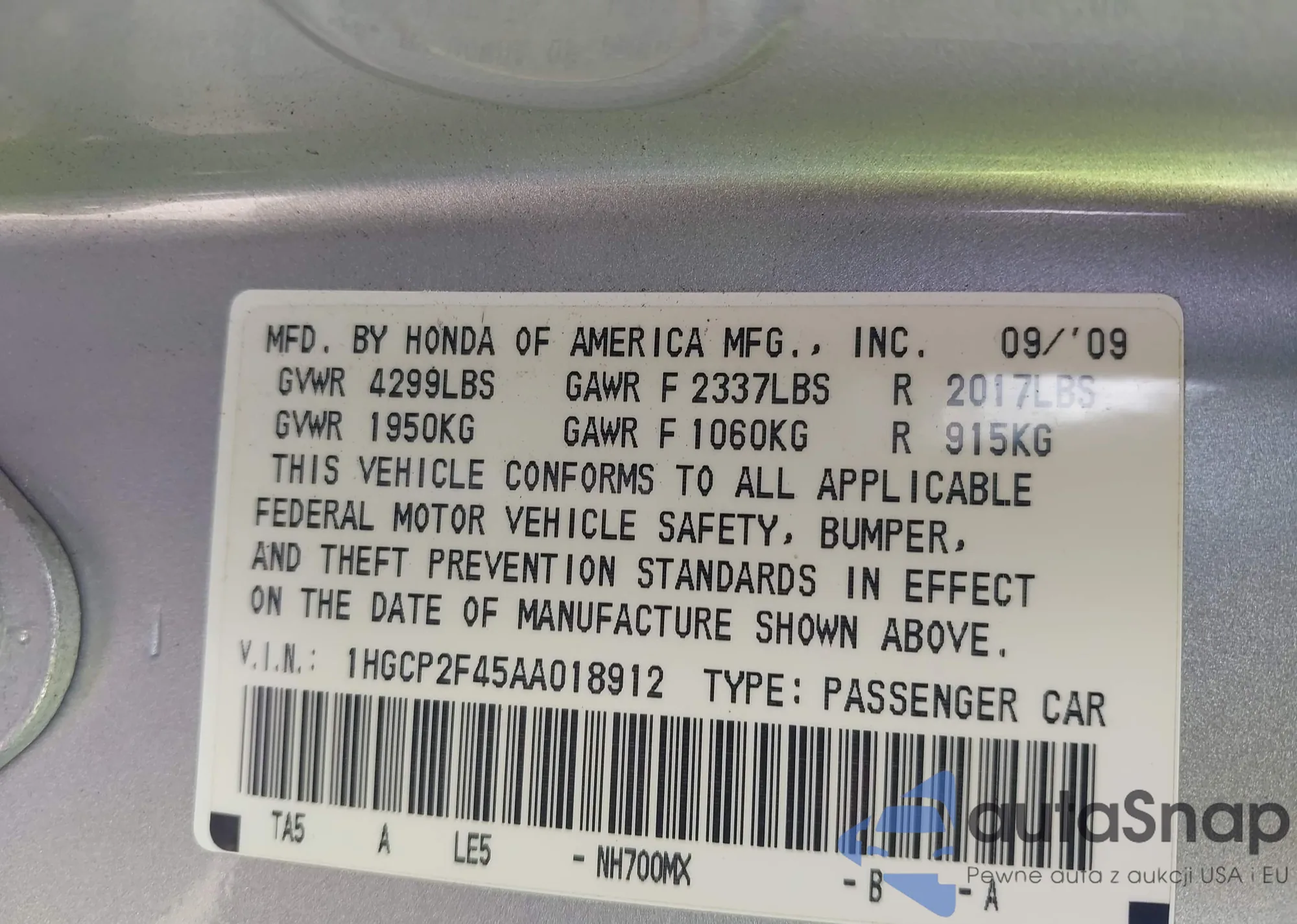 LOT: 43336912 VIN: 1HGCP2F45AA018912
