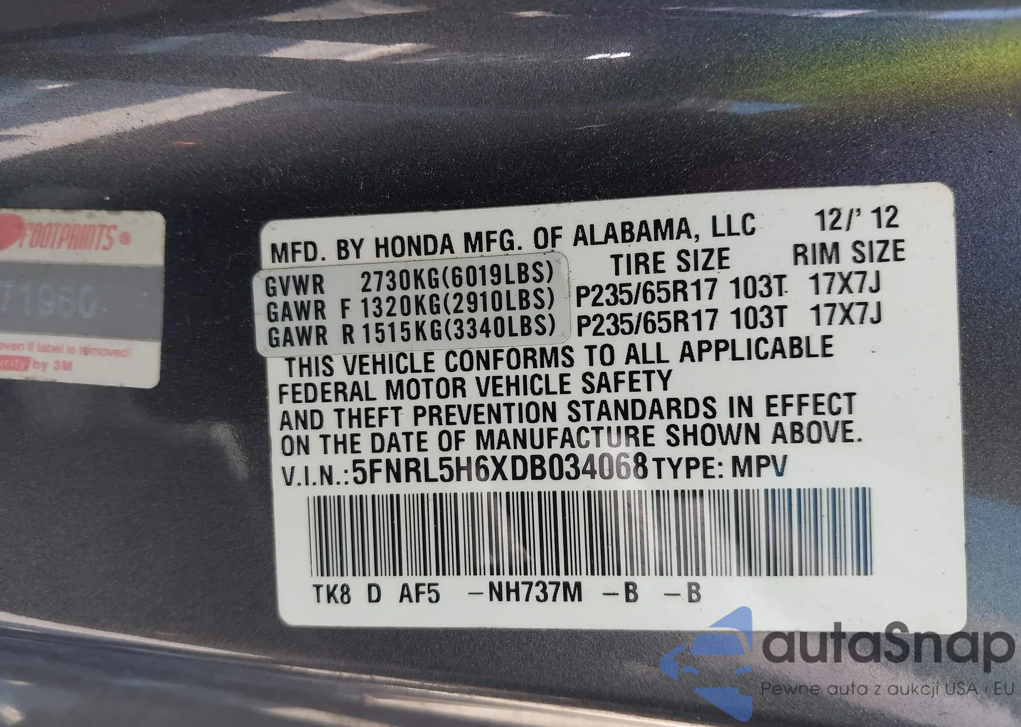 • VIN 5FNRL5H6XDB034068