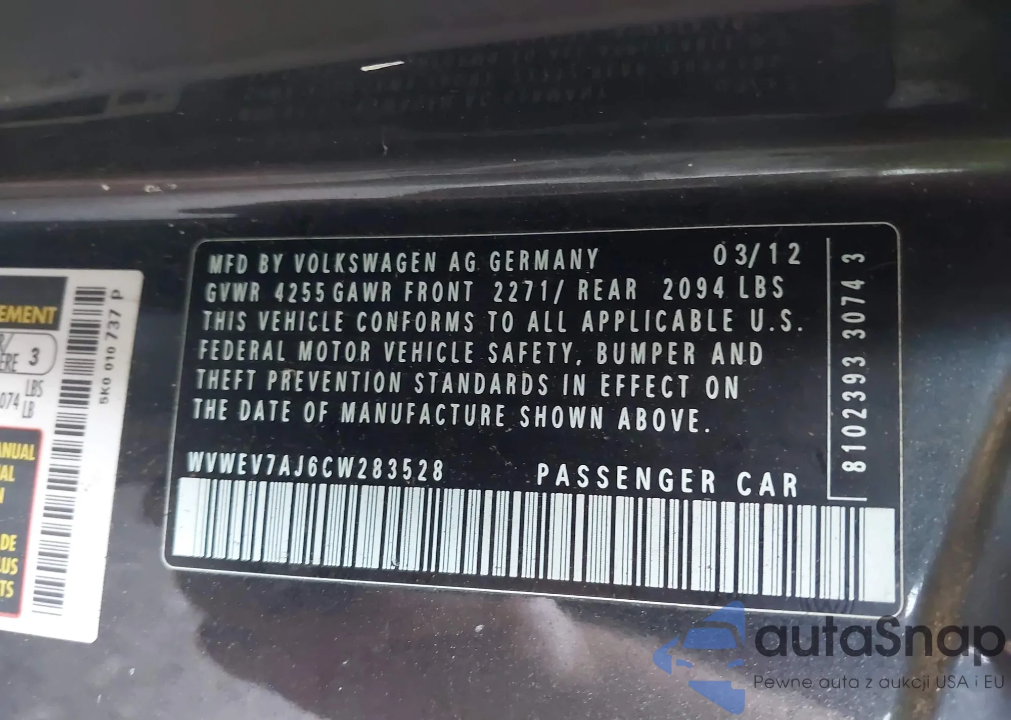 • VIN WVWEV7AJ6CW283528