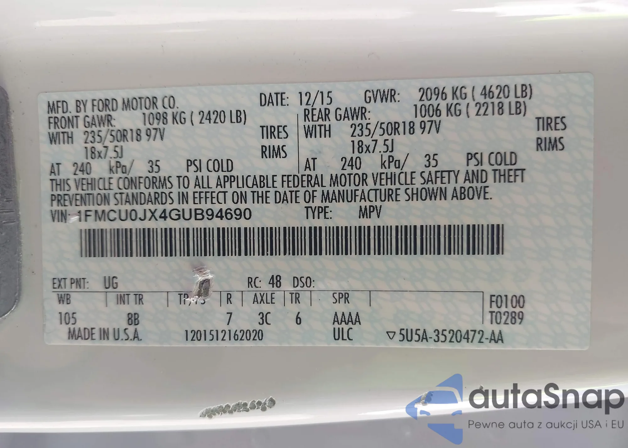 LOT: 42826636 VIN: 1FMCU0JX4GUB94690