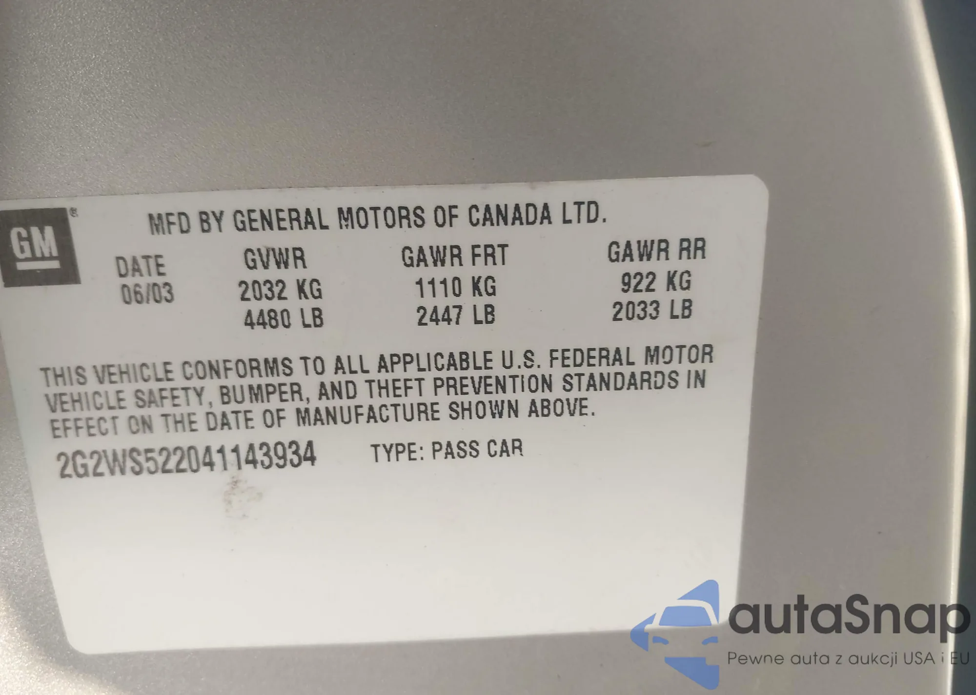 • VIN 2G2WS522041143934